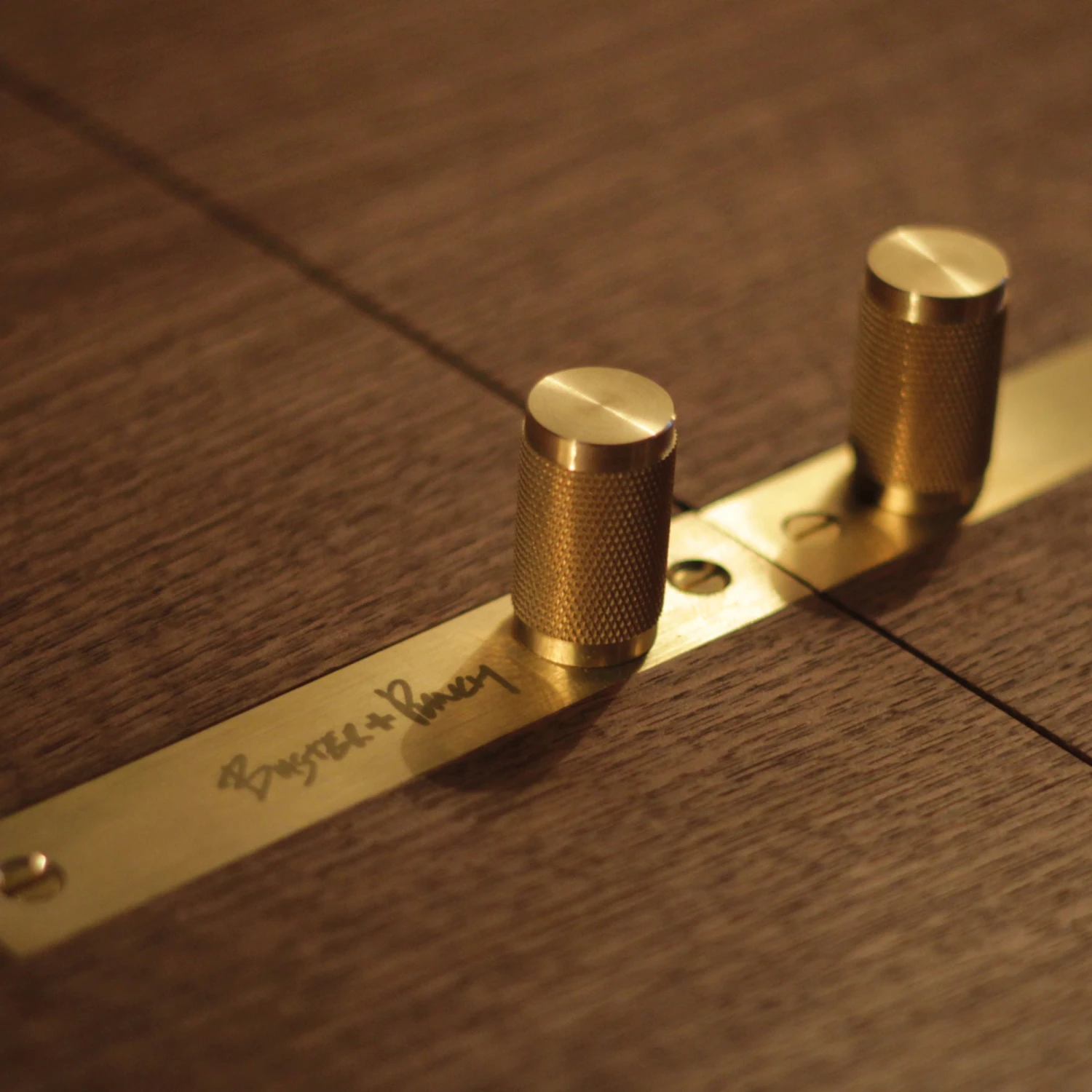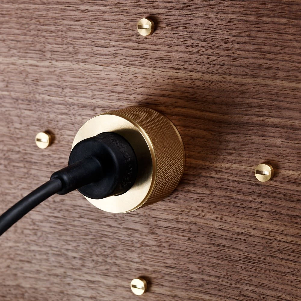 The bar has a quilted grey berry silk back panel and is fitted with a knurled solid brass light fitting, complete with a snake’s heat cage for protection. The bar is then finished with our signature brass coin screws, a set of knurled brass furniture handles and a diamond-etched brass logo plate. The bar has mechanical soft-close walnut doors.