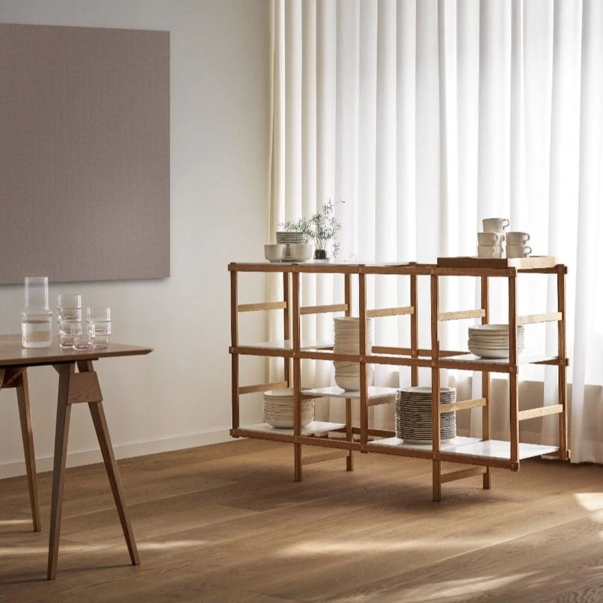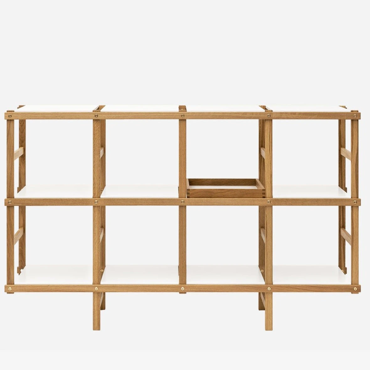 Solid oak, solid brass. Shelves: White lacquered MDF. Tray: Solid oak, white lacquered MDF.