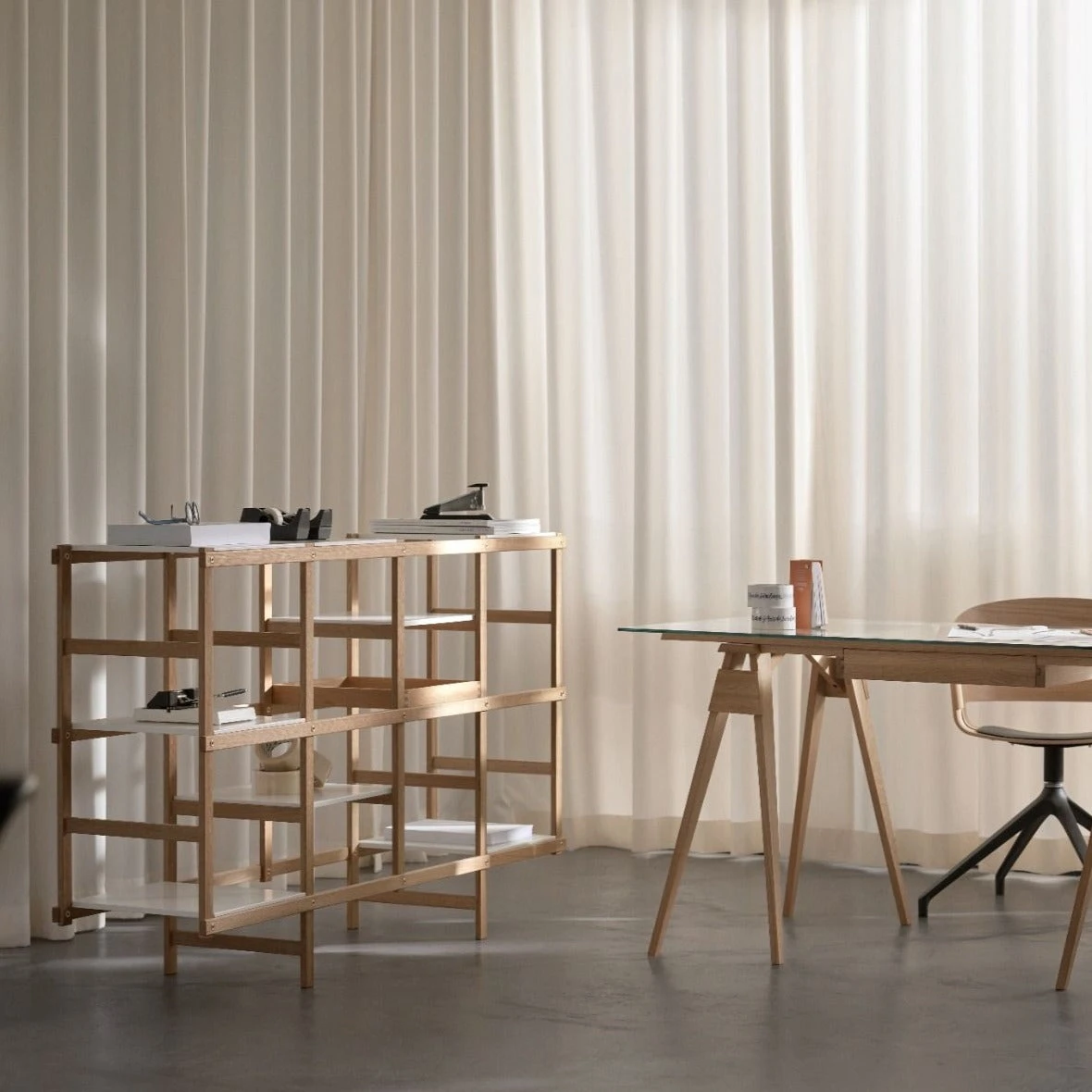 Mathematical precision allows the grid-construction to carry shelves, trays and boxes that are easily moved around without any tools.