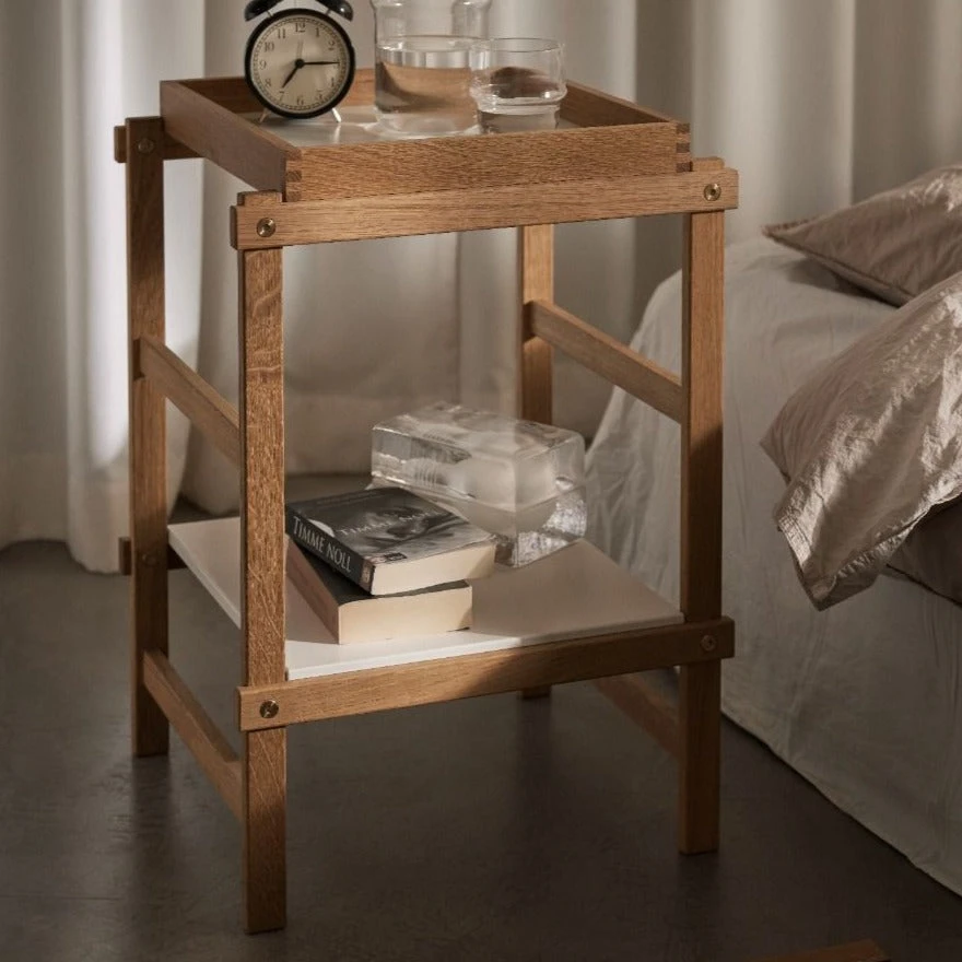 Solid oak, solid brass. Shelves: White lacquered MDF. Tray: Solid oak, white lacquered MDF.