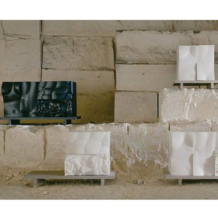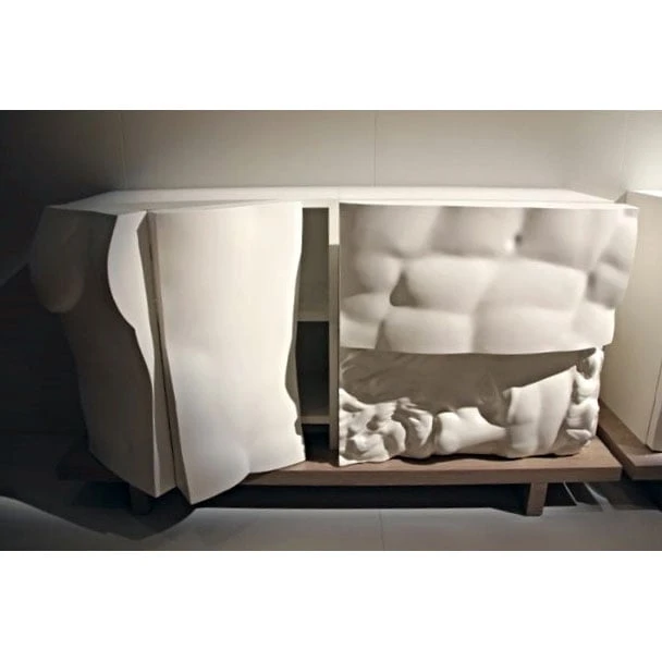Designed: 2015 Modular Cabinet Origin: Italy Modular combinable box system based on the classical marble statues of Hercules and Aphrodite. Front made of high density polyurethane, matt lacquering in black. Structure of the containers in wooden strips, matt lacquering in black. Left Modules with folding wing door. Right Modules with pull-out drawers and internal tray. Base made of poplar chipboard reinforced with tubular steel inserted inside, in grey painted oak finish. Available in various module compositions and in Matt white. Size: Base W 205 cm, Module W 90 cm (x2), D 60 cm, H 111 cm.