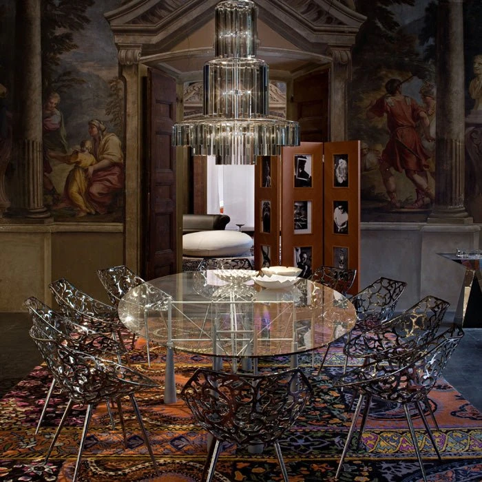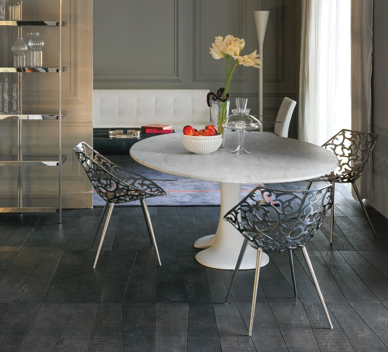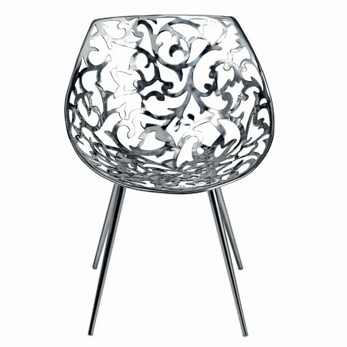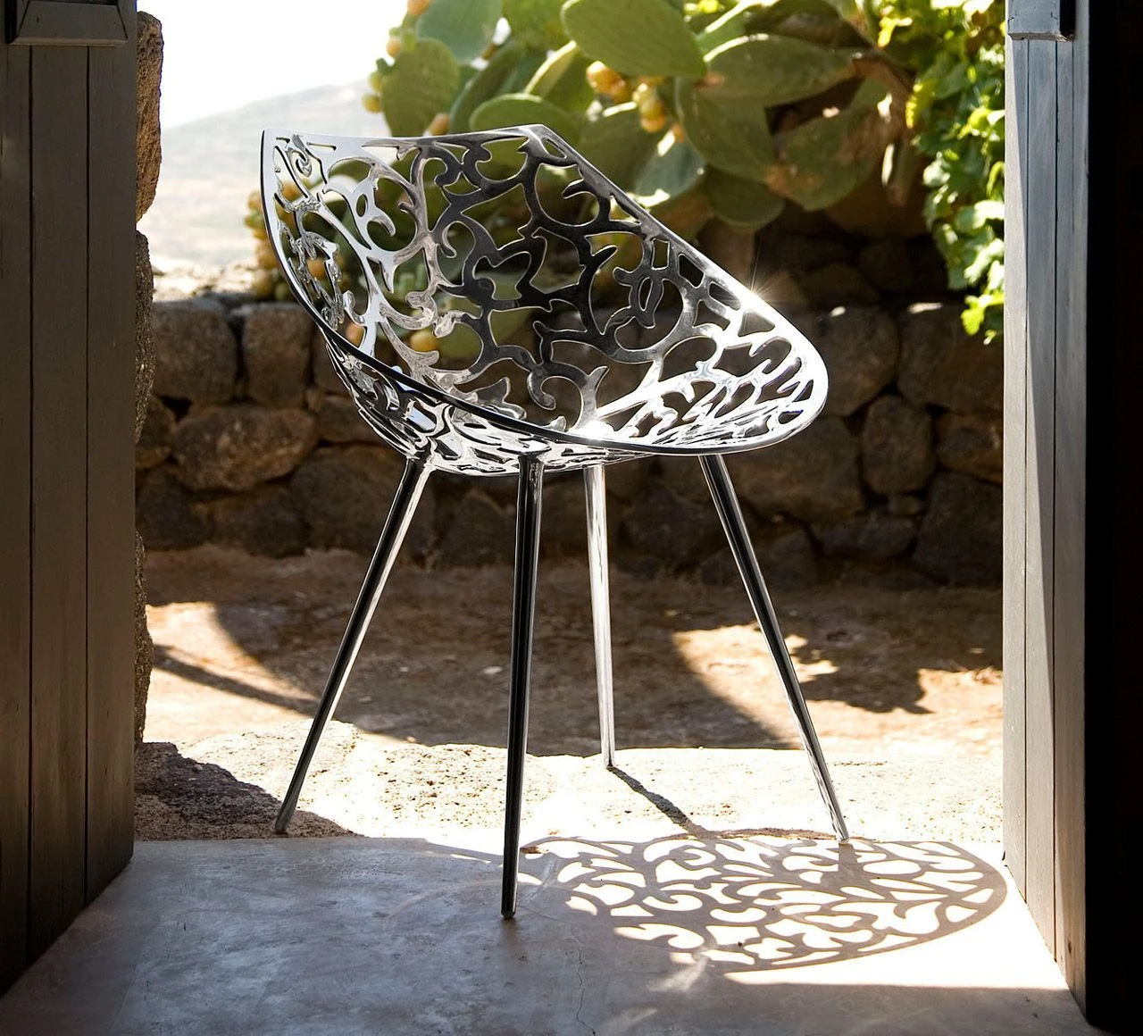 Driade Miss Lacy Chair Philippe Starck – obtained from the ancient lost wax casting technique, miss lacy represents and makes accessible a baroque lace by transforming it into an embracing shell. characterized by the expertly pierced shiny mirrored stainless steel. it is unique that compares more to a jewel than to a functional object. the tapered legs are then welded to the shell, once polished, and the final result is a perfect monoblock. it is one of the products with the highest level of craftsmanship of the entire driade collection.