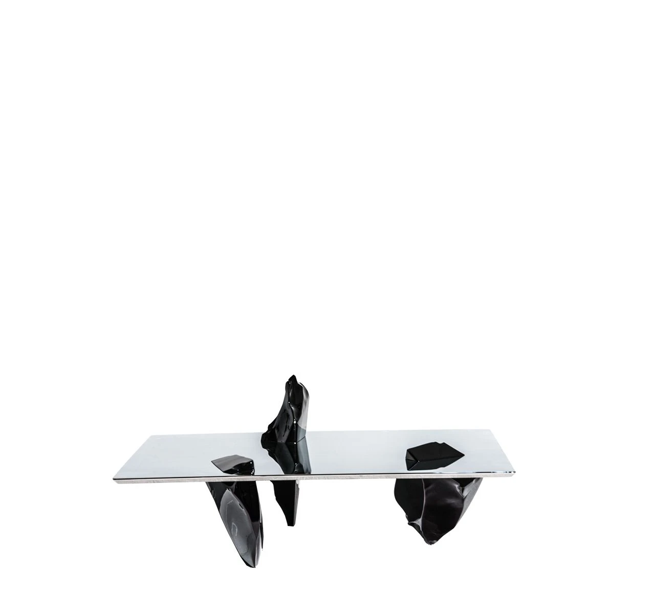 Sereno by Driade is a coffee table sculpture legs in cast aluminum in gold plated or black titanium finish and MDF top with mirror polished stainless steel coating. Fredrikson stallards work often exudes an energy like that of abstract expressionism, a forcing by the artists hand or a chaos within the materials and forms themselves, albeit an organized chaos.