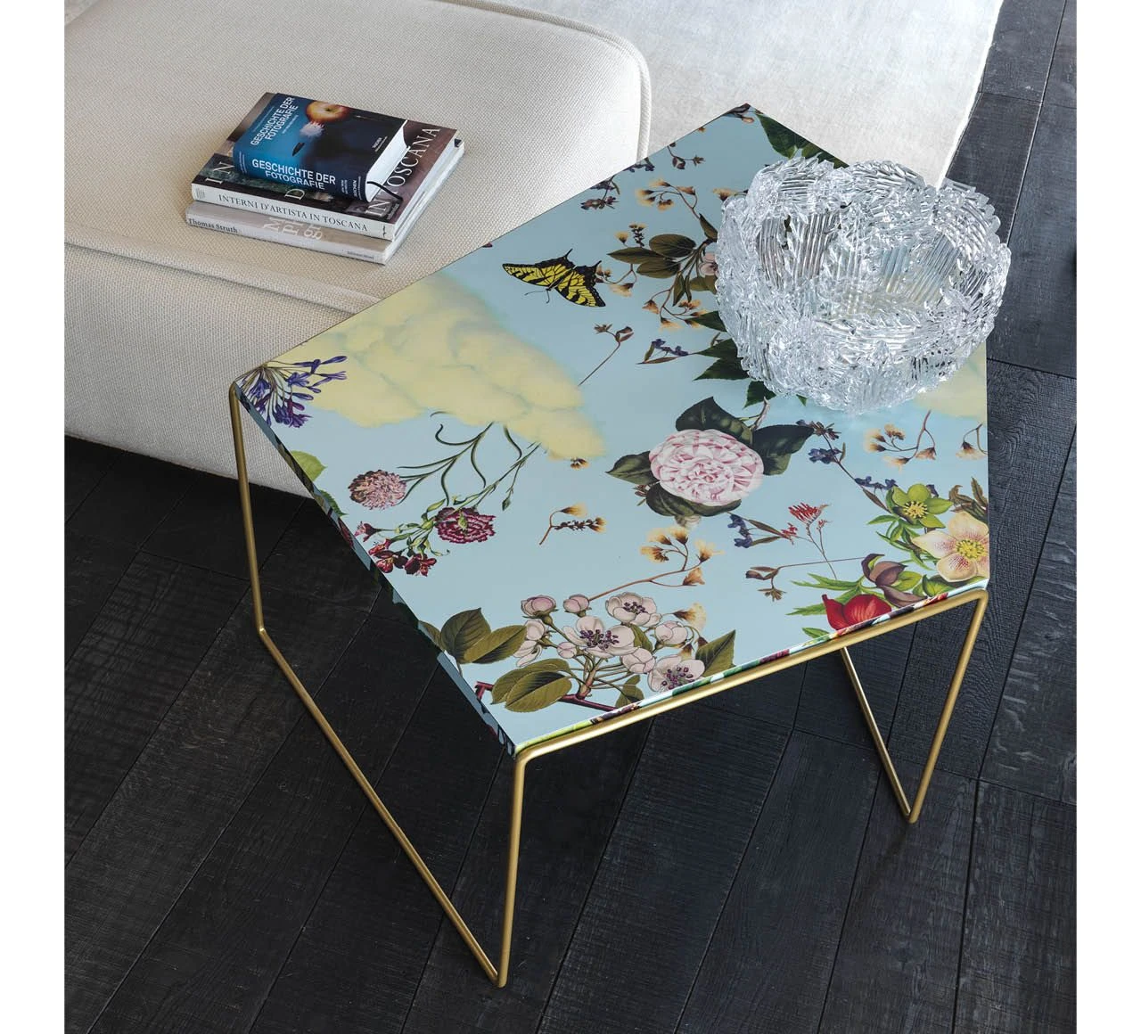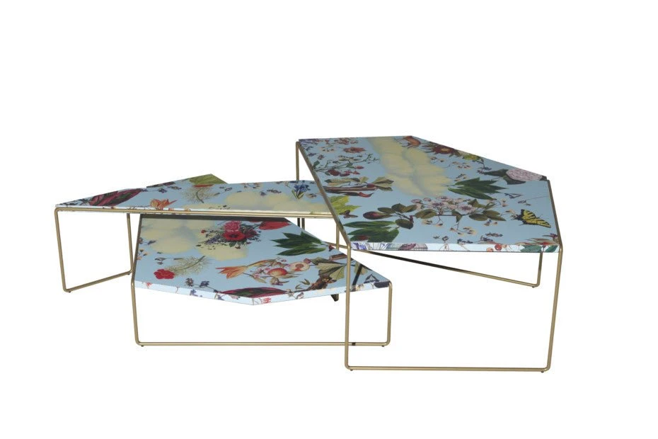 Driade Zagazig Coffee Table – Their shapes are irregular and dynamic, available in three different heights and sizes.Just like the ziqqurat cabinet, each top comes in three different patterns made of digital printed bilaminate with contemporary, very distinctive, designs: vintage collages, optical decors, textures that interpret the weaves suggested by the creativity of current trends. The frame is in gold-coloured tubular steel. This nostalgic yet trendy choice adds elegance and charm to these pieces.