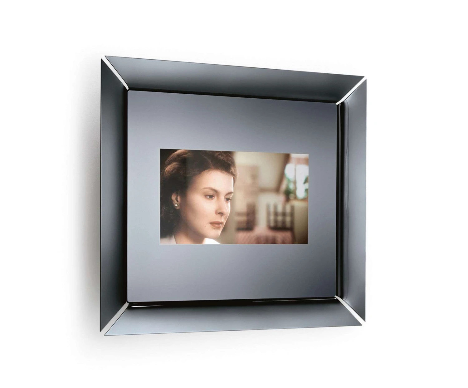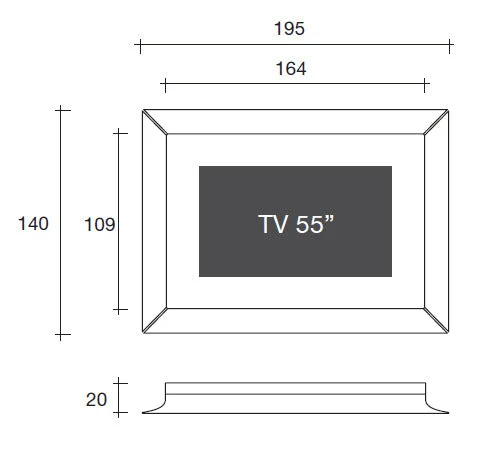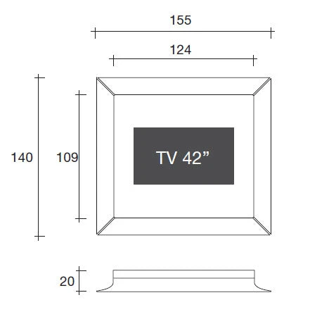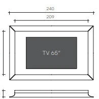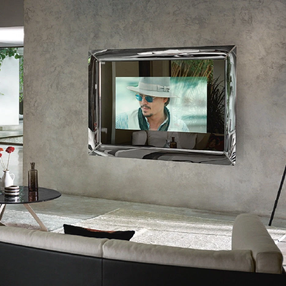 The mirror is in semi-reflective black glass, partially back-painted. The central part of this mirror, where the TV goes, is not lacquered to allow correct visualization of the TV. Thus, the perimeter around the TV is the section inscribed in this black back-lacquer. This mirror must be used with a flat screen with rear VESA connections and a front frame that does not have any projection. Also, the customer is responsible for checking the compatibility of their TV with this system. The hardware used to install the TV inside the mirror, including nuts and bolts, is not included.