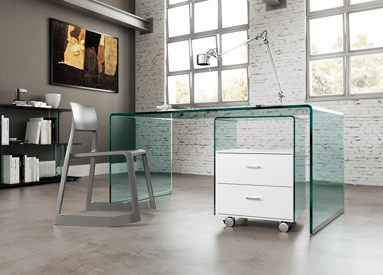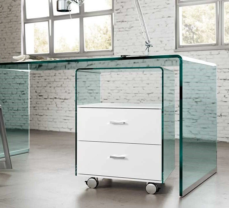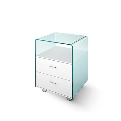 Drawer unit in 8 mm curved transparent glass. The drawers have white lacquered wood frame.