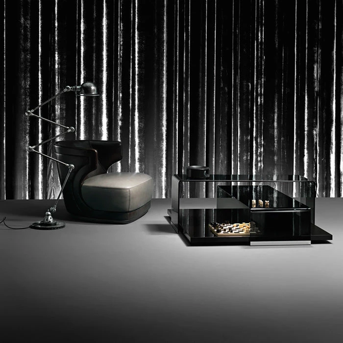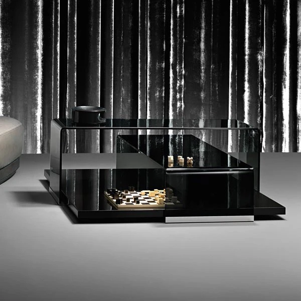 Coffee Table Origin: Italy Coffee table with gloss lacquered black wooden base and two overlapping bridges in 12 mm thick smoked curved glass. The bridges have dimensions (116 x 50 x 30 cm) and (120 x 35 x 45 cm) and the base are independent and can be arranged to personal preference. Gloss finish aluminium strip feet. Size: 120 x 120 x H 45 cm.