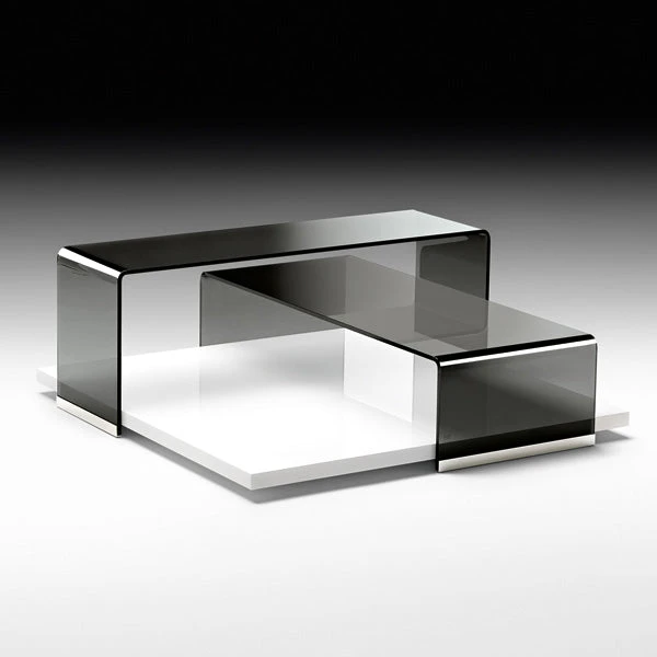 Coffee Table Origin: Italy Coffee table with gloss lacquered white wooden base and two overlapping bridges in 12 mm thick smoked curved glass. The bridges have dimensions (116 x 50 x 30 cm) and (120 x 35 x 45 cm) and the base are independent and can be arranged to personal preference. Gloss finish aluminium strip feet. Size: 120 x 120 x H 45 cm.