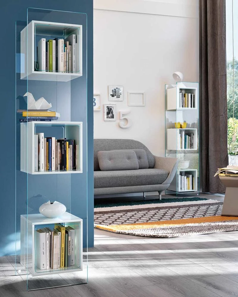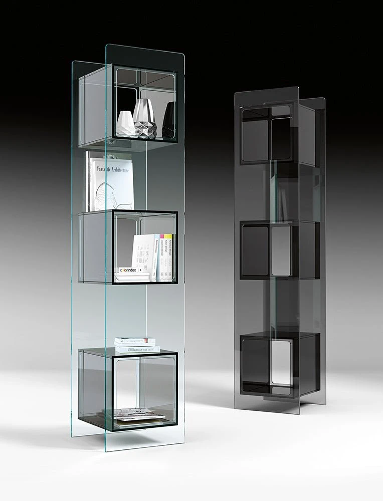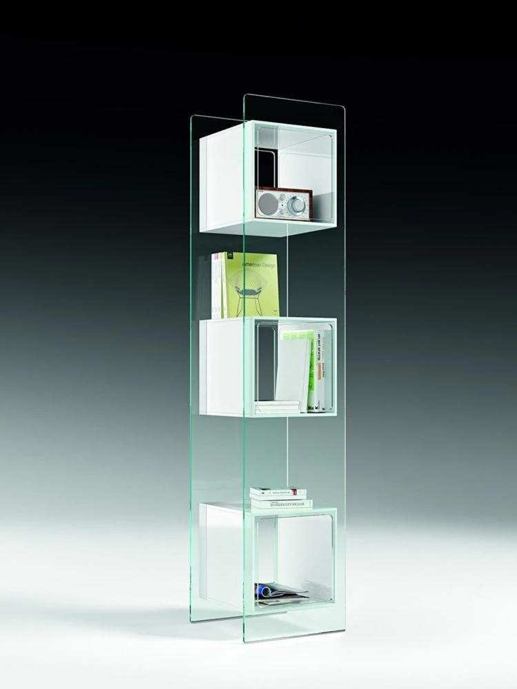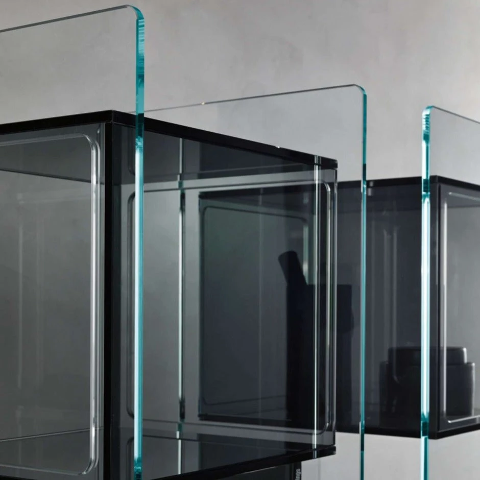 Fiam Magique Totem w Compartments Glass – Side table with container in 10 mm welded glass. Available in various finishes: transparent glass structure and container; extralight glass structure opal white glass container; extralight glass structure, smoked grey glass container; smoked grey glass structure, Black95 glass container.