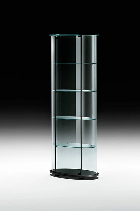 Fiam Palladio Showcase Cabinet in 6 mm-thick curved glass, with four 6 mm-thick glass shelves (L 58 cm, W 31 cm), 12 mm thick glass top. Variation of 12mm cabinet bases including : Extra Light Glass – Back Silvered, Extra Light Glass – Black Back Lacquered, Extra Light Acid Etched Glass – White backed and Wooden Base in Walnut Canaletto.