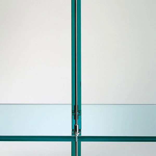 Origin: Italy Bookcase open on two fronts. Shelves and uprights made of 15mm thick float-glass. Chrome-plated metal ties. Due to the high-compression coefficient, the tension makes the bookcase a single block.