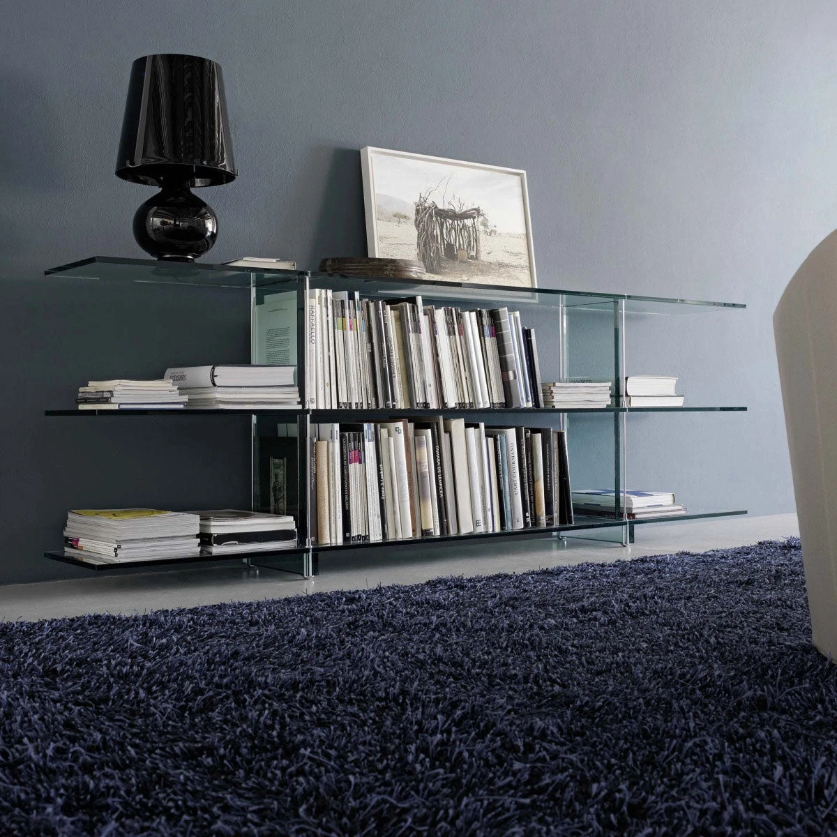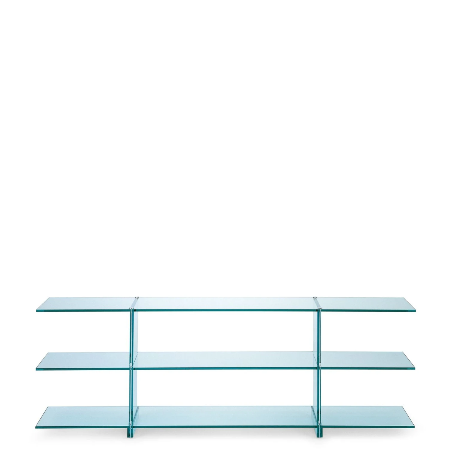 Console open on two fronts. Shelves and uprights made of 15mm thick float-glass.