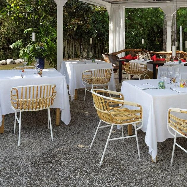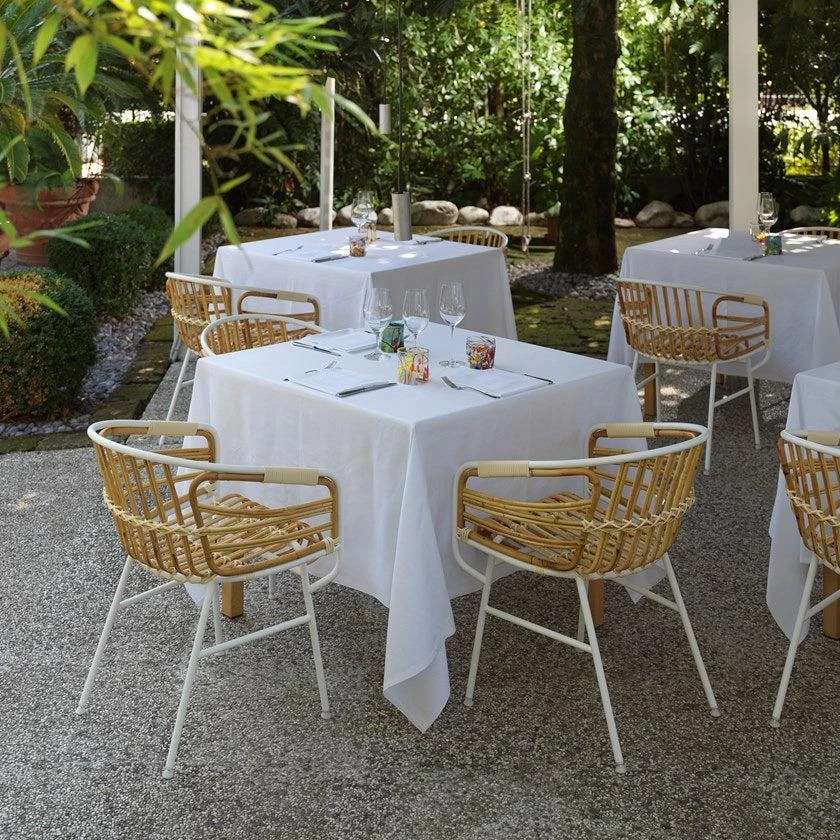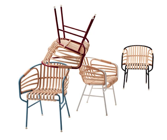 Raphia is the offspring of a research project into the use of materials and how they can be exploited as furnishings. It is the perfect convergence of modernity and tradition, of technology and craftsmanship. An oxymoron that brings together two of the spirits of production in Italy: the metal industry and the small timehonoured manufacturers of rattan and wicker products. The aim of the project is to lend a certain continuity to the tradition of crafting with rattan, one that stretches back to the beginning of the last century when the areas specialising in this craft saw schools and a culture revolving around this material thrive. Today, there remain very few firms which conserve the know-how of this trade, where manual skills and craftsmanship combine to insure that every creation is unique. Raphia embodies this history and tradition in a contemporary context, thanks to a harmonious balance between two materials: the metal structure is the base upon which the wicker and rattan are weaved to create the seating area.