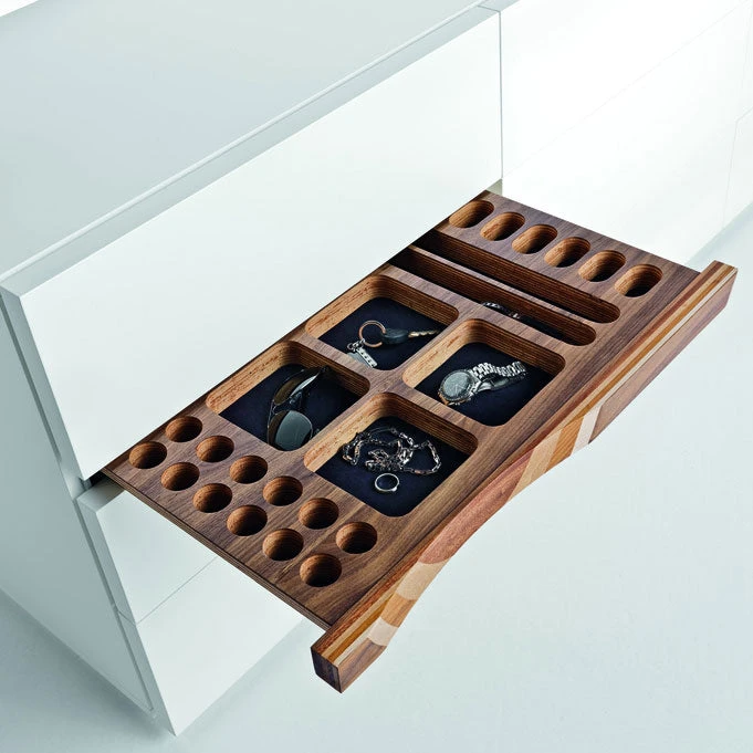 Jewelry drawer with ripples front. The solid wood tray hosts a variety of compartments for jewlry, watches, sunglasses etc.