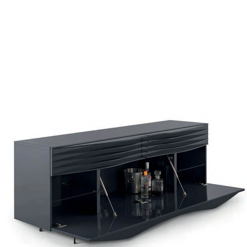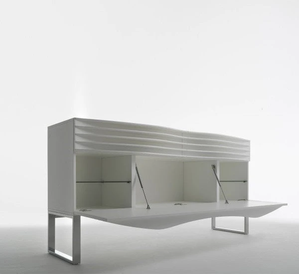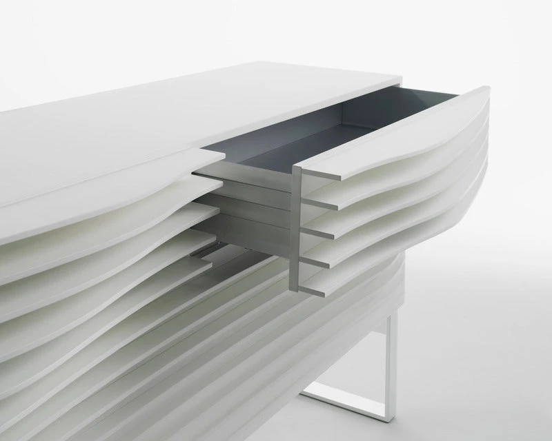 Tide Buffet reflects the style of its designer, Karim Rashid, who worked with various movements and dynamics in this project. The horizontal development of the front, made of evenly-spaced, thin sheets of MDF, confers a gentle and sculptured aspect to the whole. In addition to its remarkable design, Tide appears as a capacious and functional cupboard, with two drawers and a flap front for the living room, or with two drawers and two deep drawers for the bedroom (Tide Com).