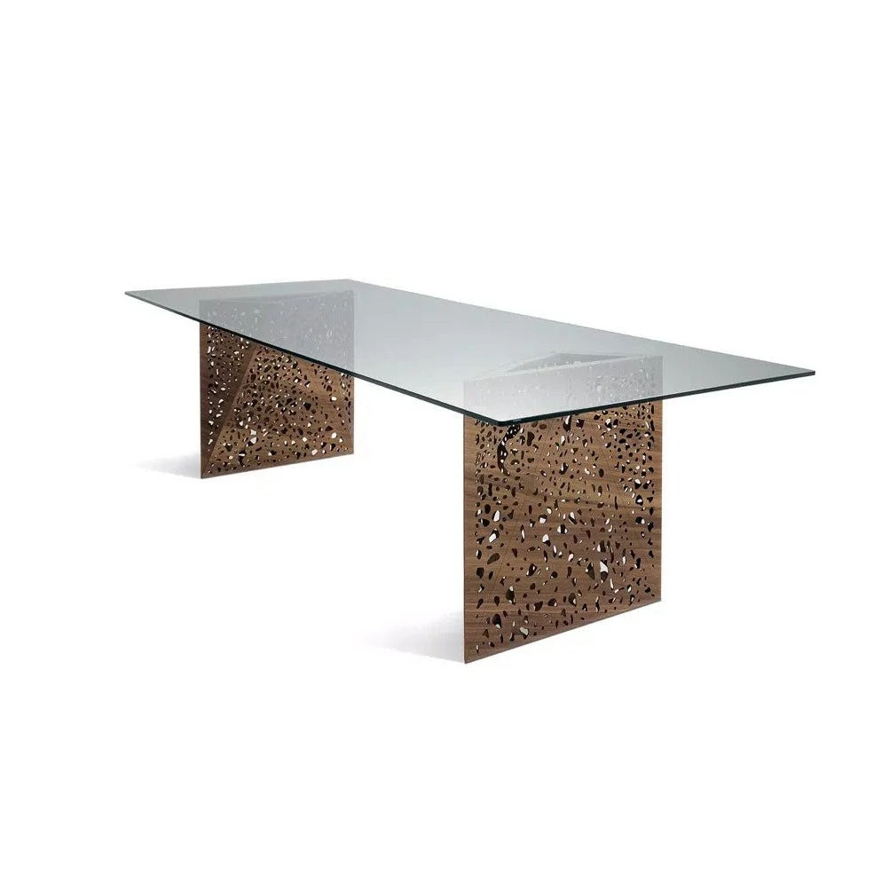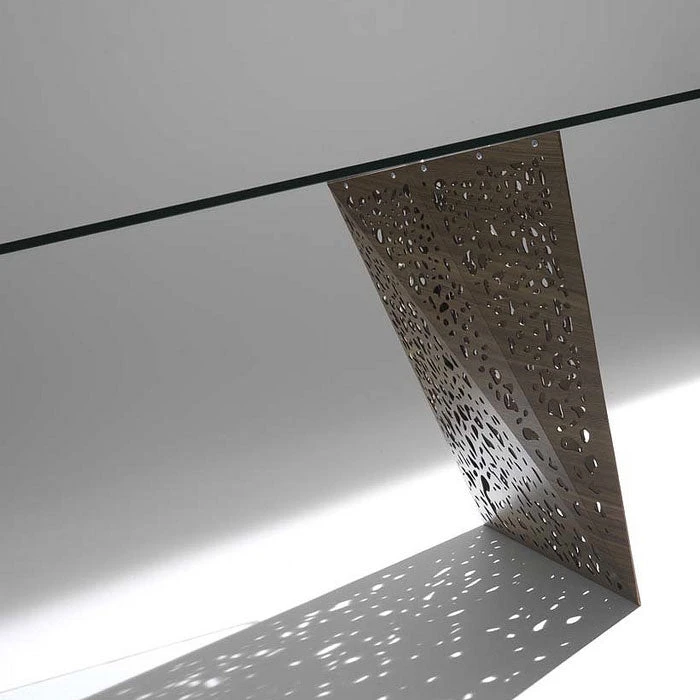 The originality and workmanship of its legs are the outstanding features of the Riddled table, which incorporates the notion of porosity found in multiple architecture works by Steven Holl. The thin sheets of wood, folded through laser engraving, make this project even more spectacular in its apparent defiance of the laws of physics. These two legs, akin to origami sculptures, allow the passage of the internal light to create a myriad of lights and shadows.