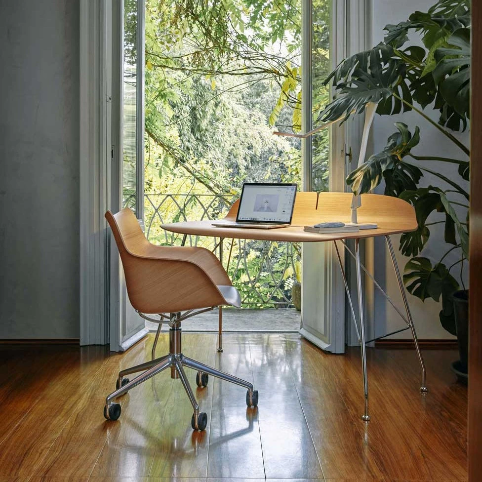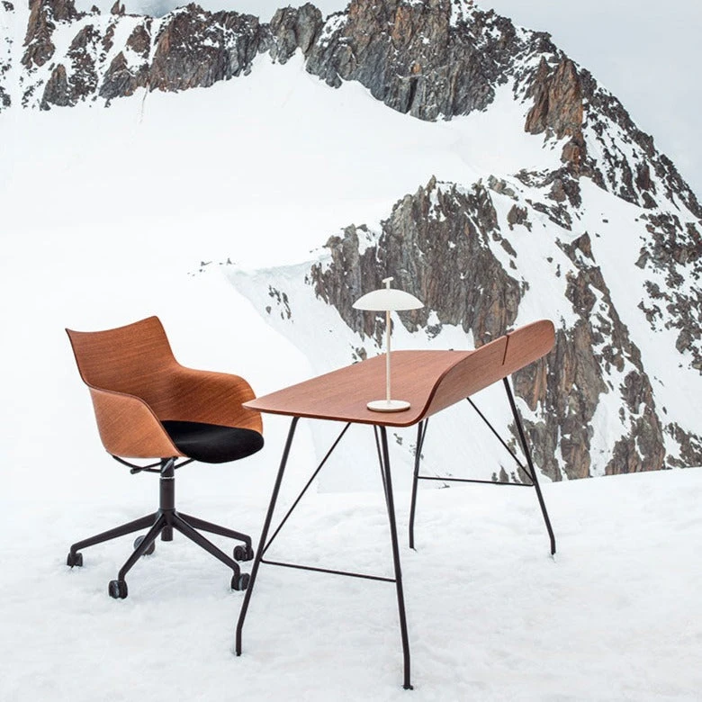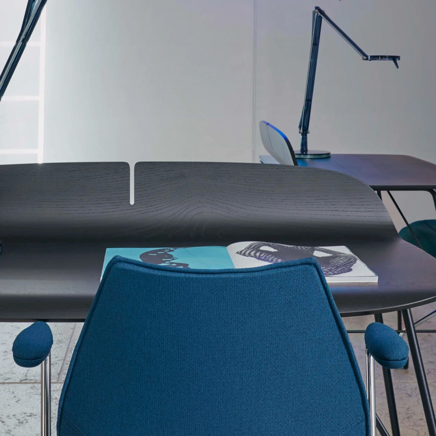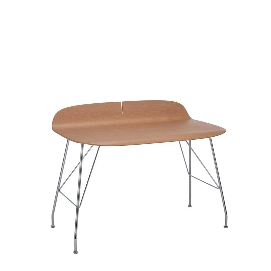 With a flattering curved wood top that hugs your wall, the Earl of Wood desk by Philippe Starck for Kartell embodies a minimalistic approach with depth from the frame constructed from chrome-plated or painted steel.
