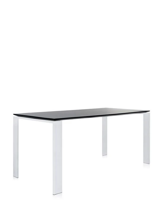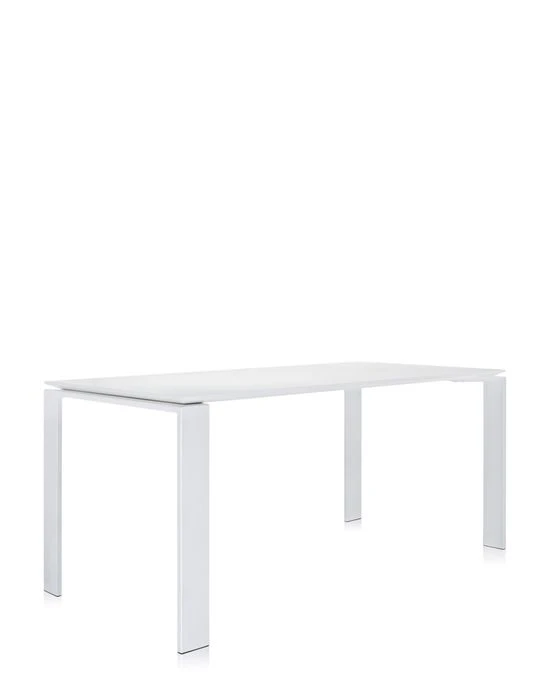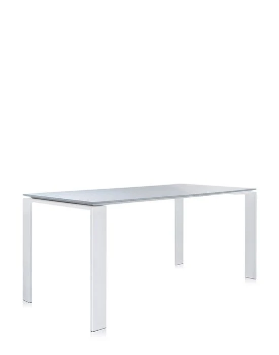 Four is available in varnished steel and a 2.5 cm thick table top in stratified laminate, white/aluminium and aluminium/aluminium comes with a satin-finish aluminium table top