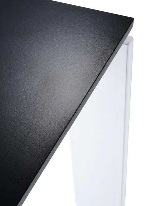 This functional and refined table also has a strict geometric design. Thanks to the elegant design solution, the position of the slim table top allows for the convenient positioning of drawers or storage furnishings for computer hardware. They can be placed side-by-side to form office workstations. Four is available with a painted steel body and a 2.5 cm thick table top in stratified laminate.