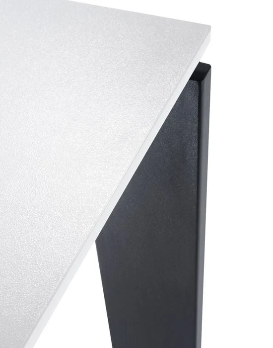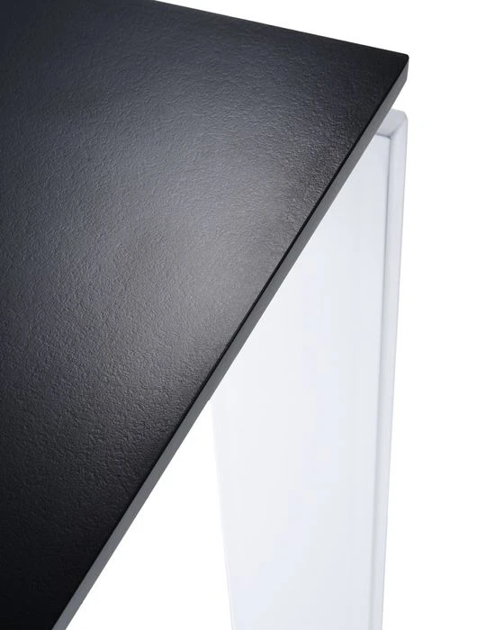 This functional and refined table also has a strict geometric design. Thanks to the elegant design solution, the position of the slim table top allows for the convenient positioning of drawers or storage furnishings for computer hardware. They can be placed side-by-side to form office workstations. Four is available with a painted steel body and a 2.5 cm thick table top in stratified laminate.
