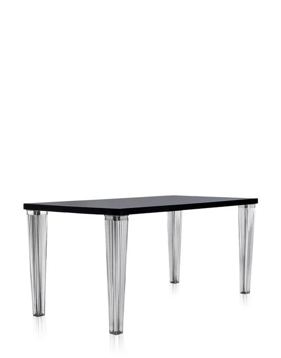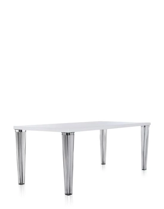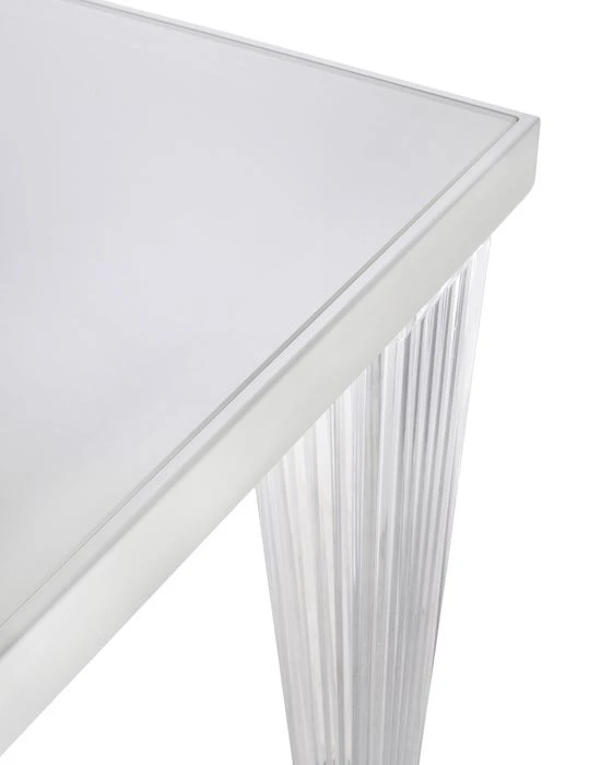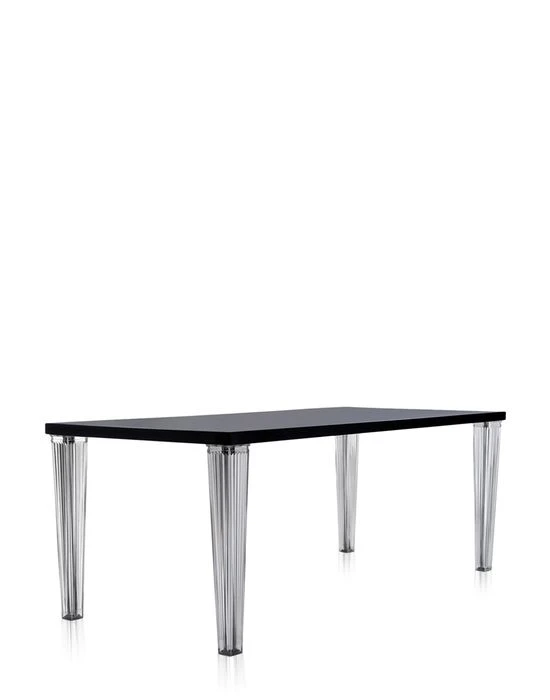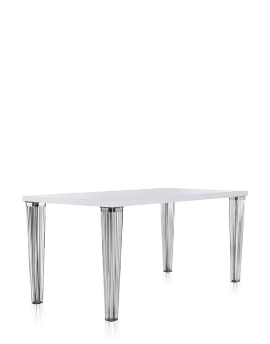 The dining version of the TopTop table combines a glossy glass surface and a transparent surface in an original way. The minimal and elegant lines are made all the more stylish by the transparent, pleated legs with a square section and metal core.