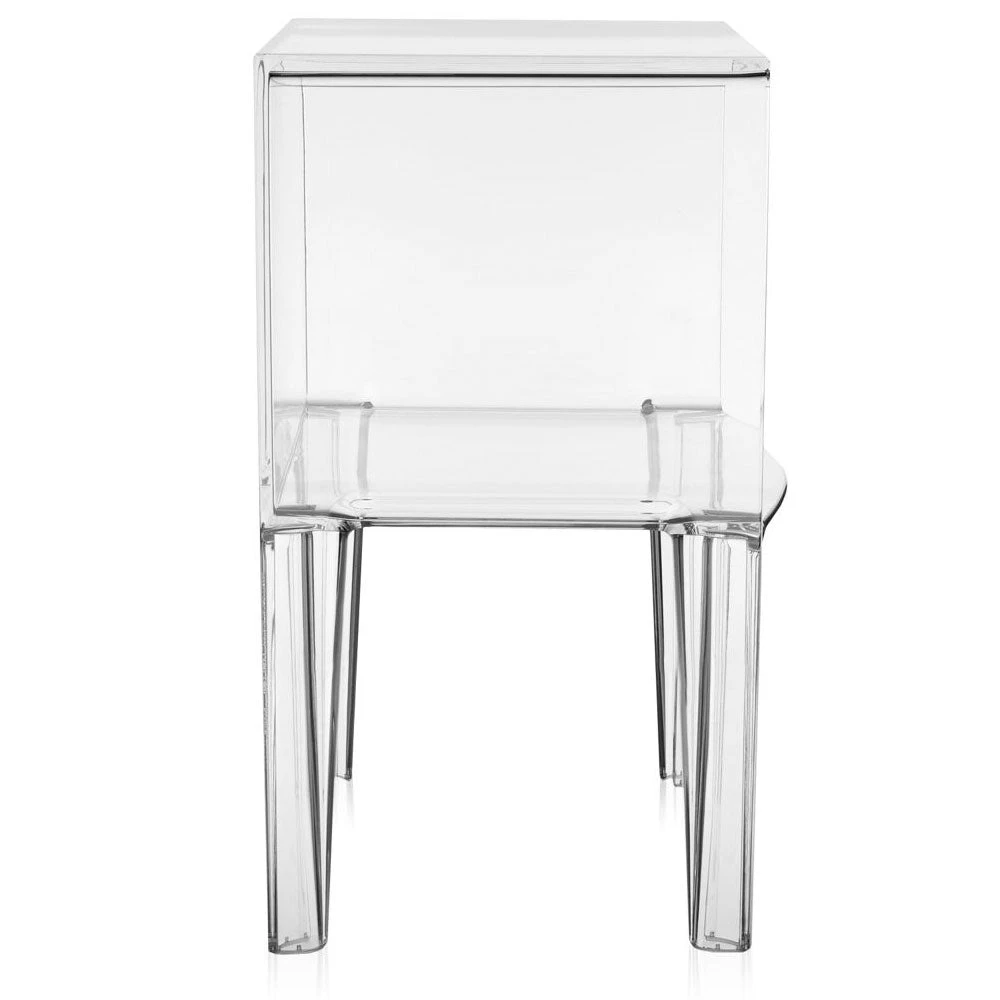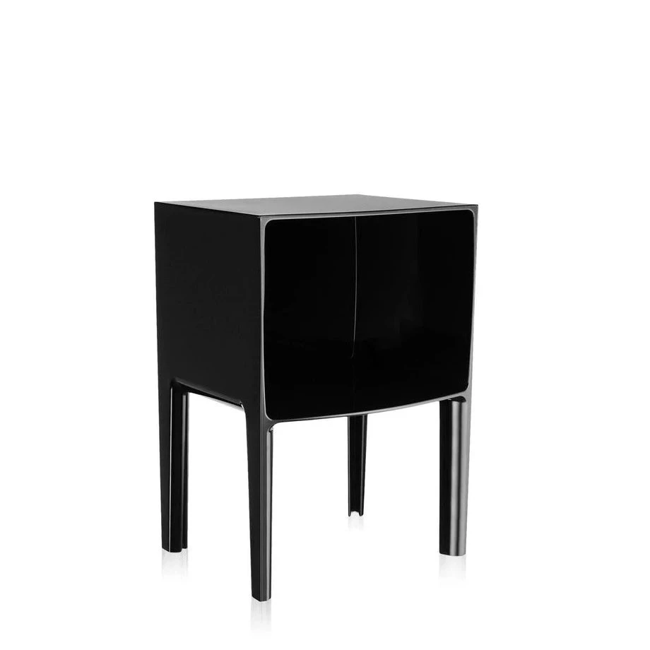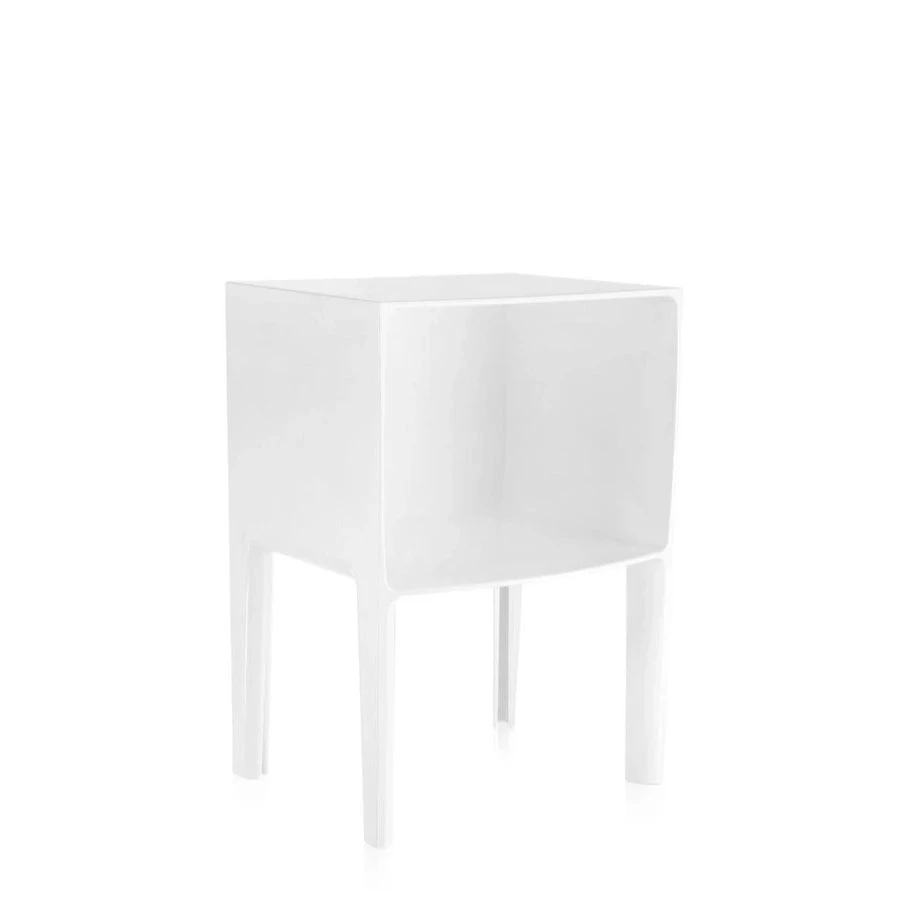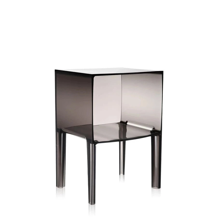 Kartell Small Ghost Buster by Philippe Starck is a night table version of the iconic Ghost Buster commode. This small, squared cuboid is supported by four legs and is available in either completely transparent, colored, or matte varieties of plastic. Just like its “big brother”, Small Ghost Buster is designed to play with reflections and perspectives, achieved through the alternating curves and corners across the entire surface. Starck developed this versatile and flexible piece that can fit into any area of the home. Manufactured from PMMA, the table measures H 57 cm, W 40 cm, and D 37 cm.