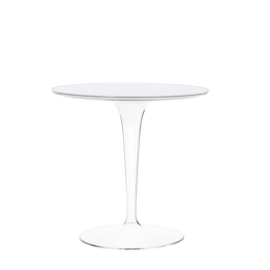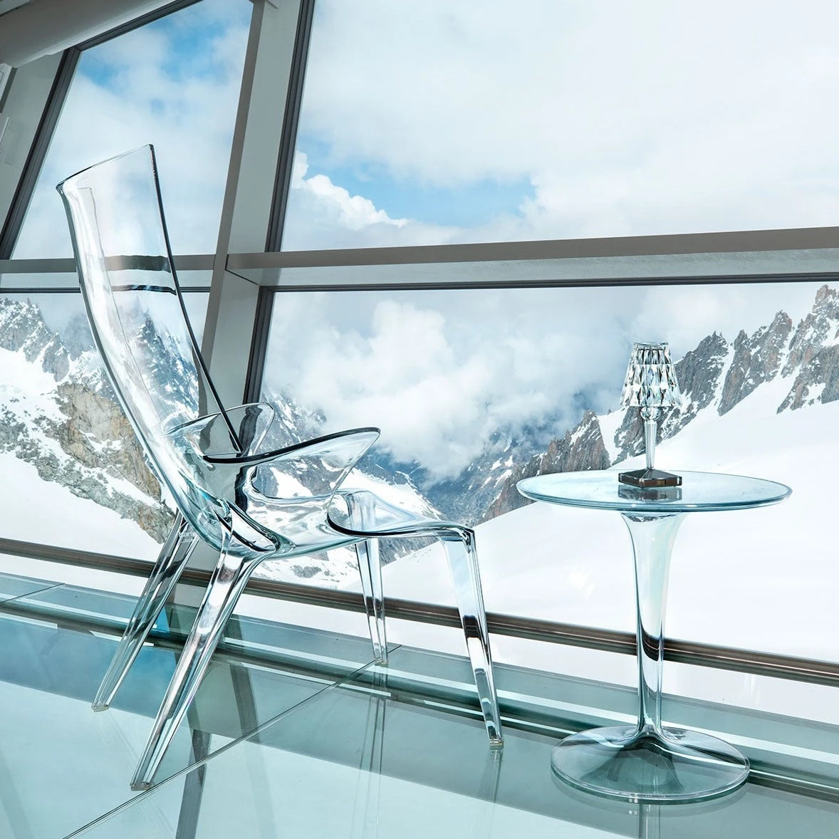 The combination of the coloured top and the transparent, hollow leg gives depth to the structure.