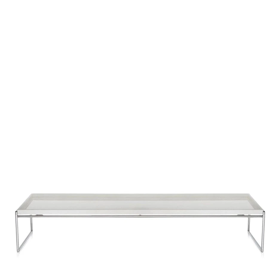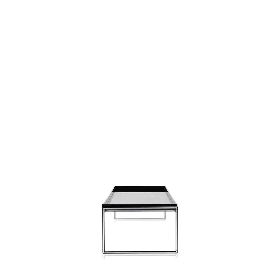 The tops, made in elegant, shiny black and white, solid polycarbonate, are available in three standard sizes, and are supported by polished aluminium structures of different heights, either floor-standing or on wheels. The overall design of the collection gives an impression of lightness and elegance, although maintaining stability and strength. Thanks to the possibility of removing the metallic structures, which have a special angled lock joint, the packaging of the product is perfectly flat, rendering transport and storing operations very practical.