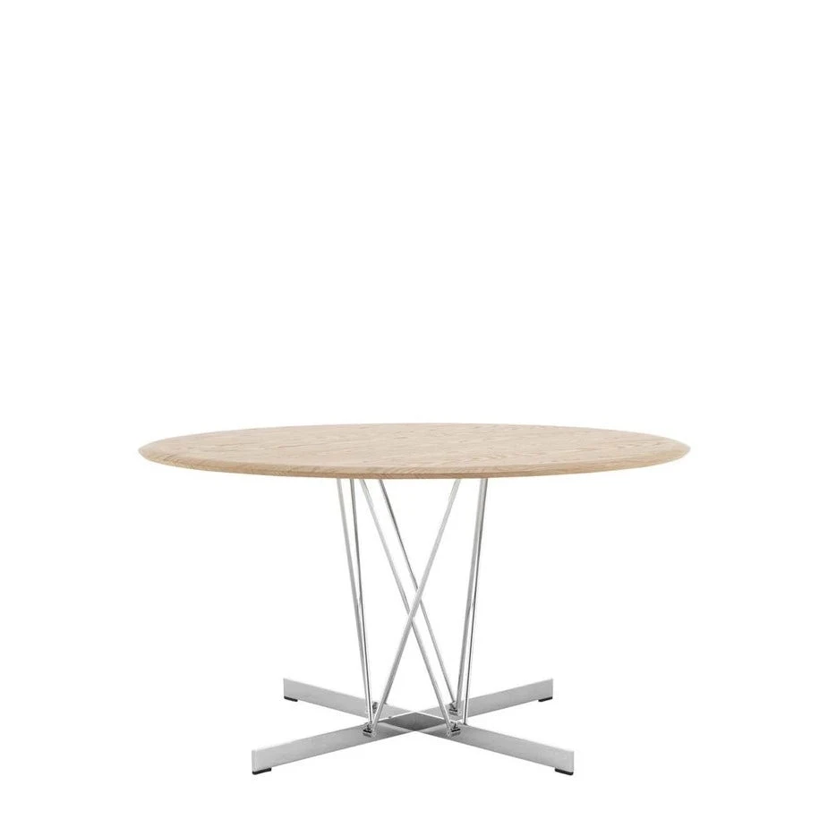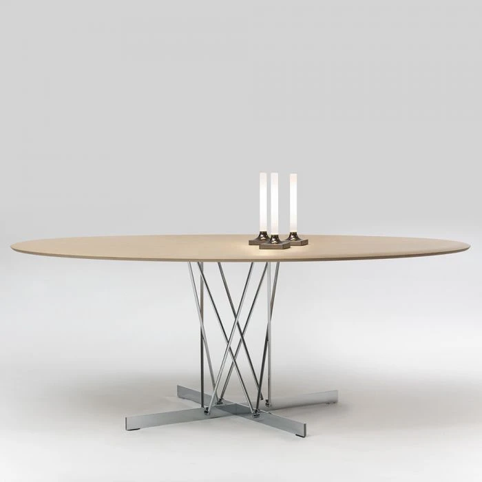 Three top finishes: light ash with two darker shades, flamed walnut and a third, characterised by thin strips of different tones of dark wood. The legs are in chrome