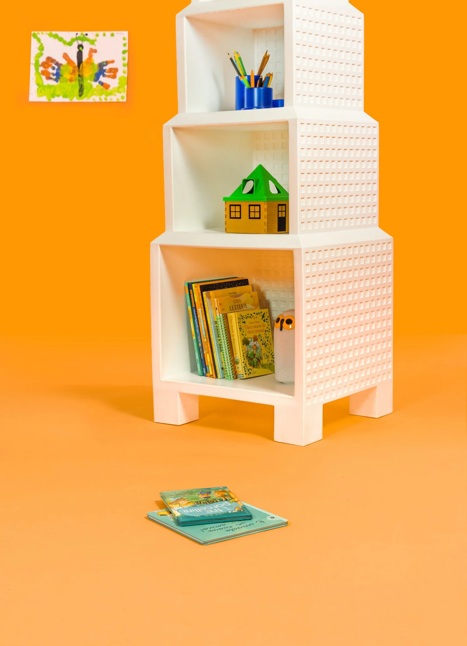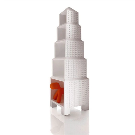 Its made in rotational-moulded polyethylene. Suitable for outdoor use. This sculptural object invites kids to use a skyscraper as a bookcase to store books and
