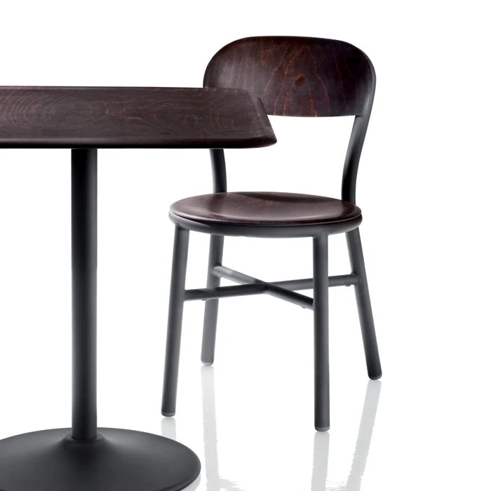 Stacking chair with frame in aluminium tube, painted in polyester powder. Seat and back in beech plywood. Suitable for outdoor use. Available in two colour versions :