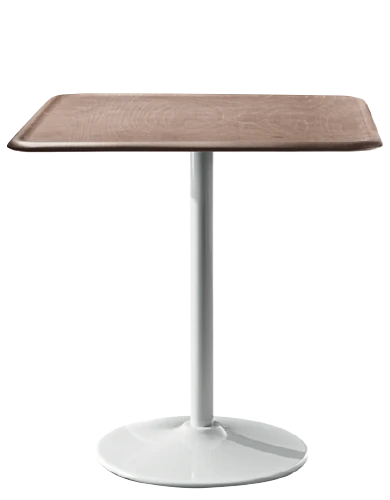 Table with base in steel plate. Frame in steel, cataphoretically treated and painted in polyester powder. Top in beech plywood. Suitable for outdoor use. Available in two colour versions, Base and frame white with pale coloured beech top or base and frame black with dark coloured beech top.