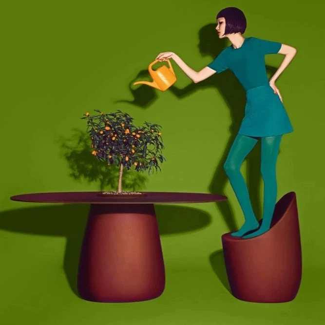 The Cobble Table designed by Elisa Giovannoni is characterised by a central base where you can insert a bucket containing plants or ice to keep bottles fresh. The thin table top is provided in materials suitable for outdoor or indoor use as hpl (full colour or black stratified) combined in different colours.