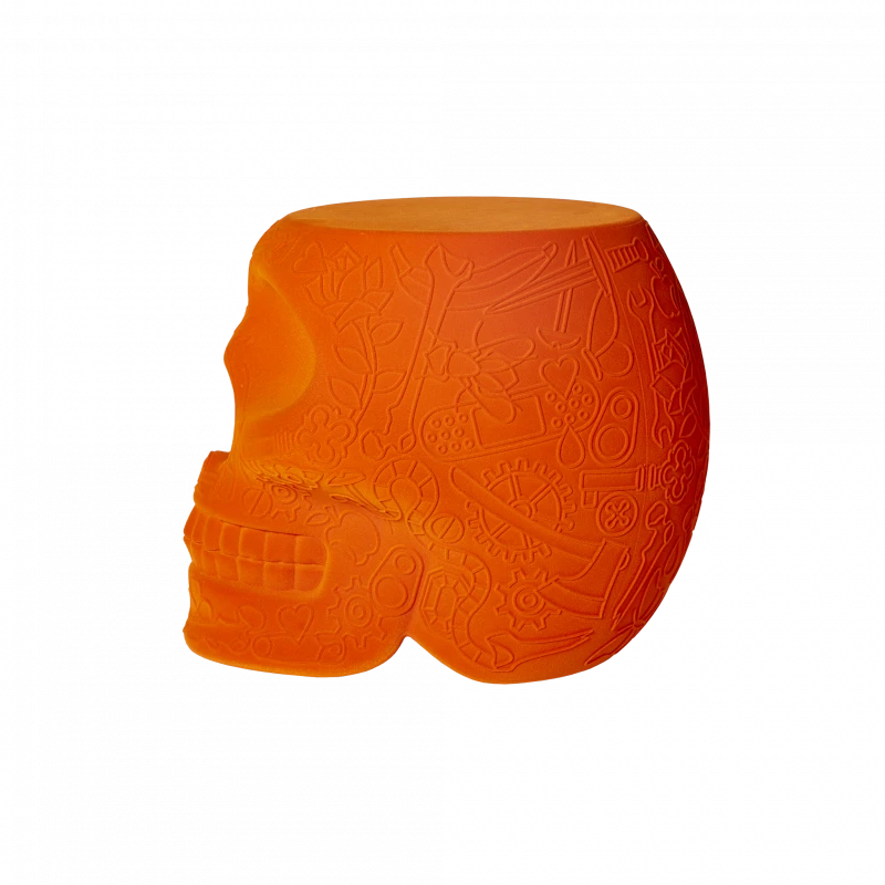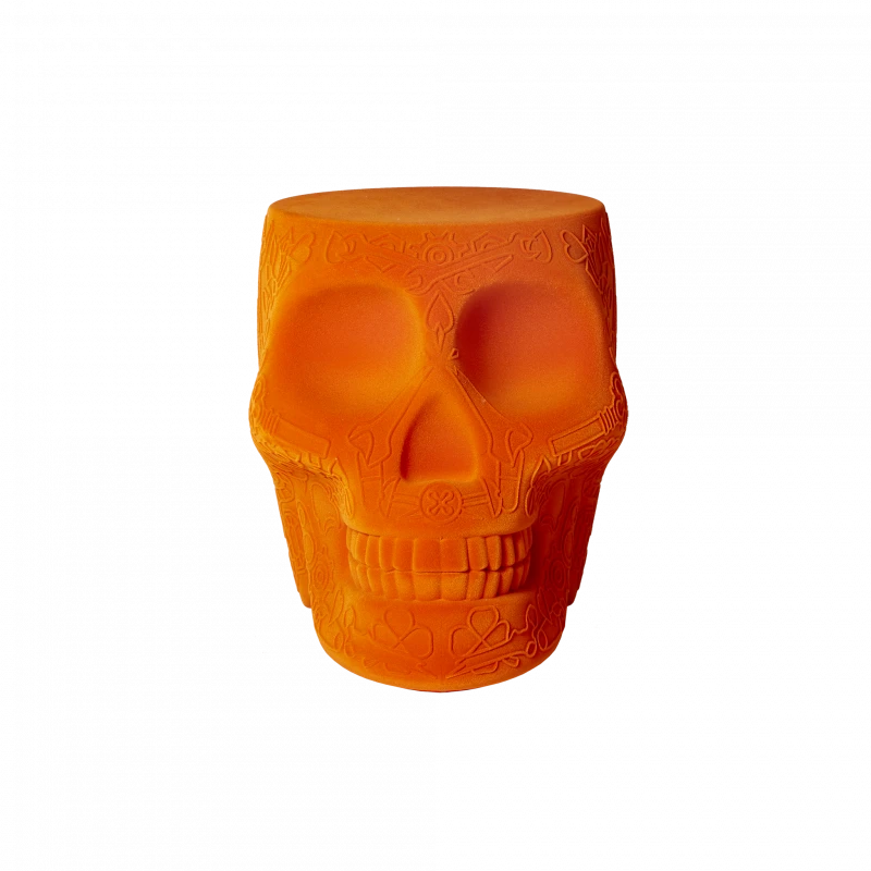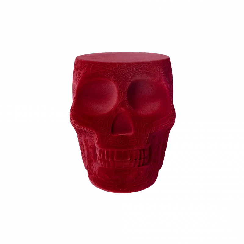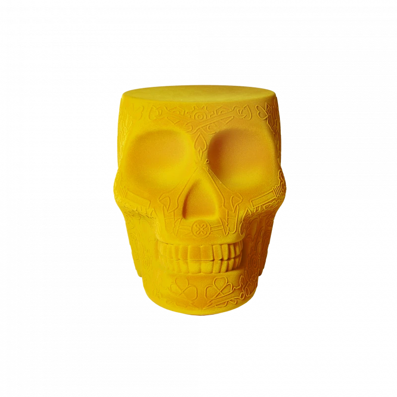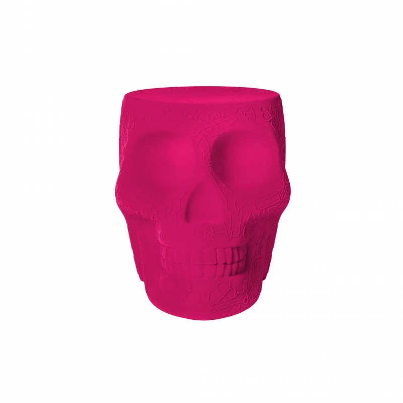 Decorated with the graphic pattern of the Mexican skull, a symbol created to exorcise death and celebrate life, it becomes an extravagant stool/table with a rigid top.