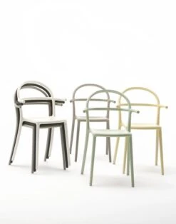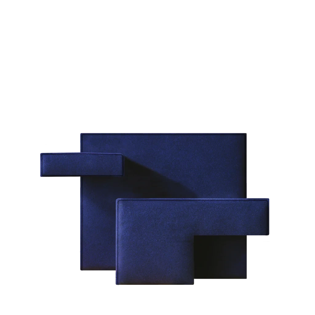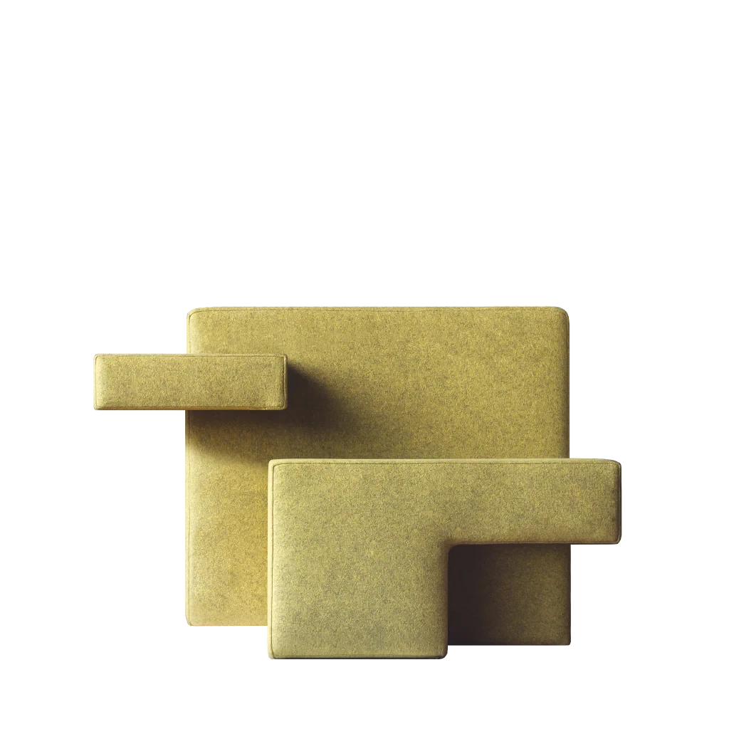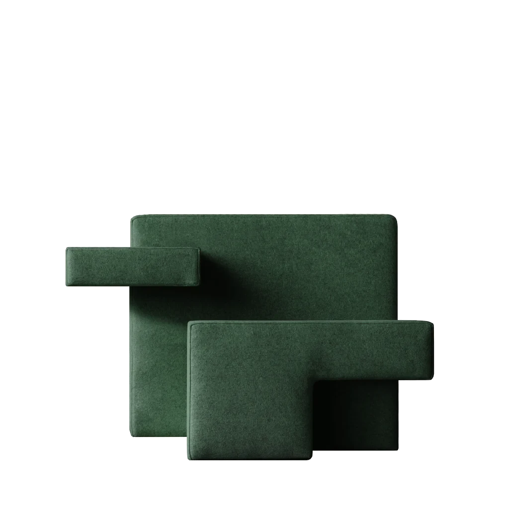 The Primitive armchair, plays on the asymmetry of primary volumes, designed byPiergiorgio Robino & Stefania Fersini. Made from a soft, padded structure and covered with melange-coloured cloth