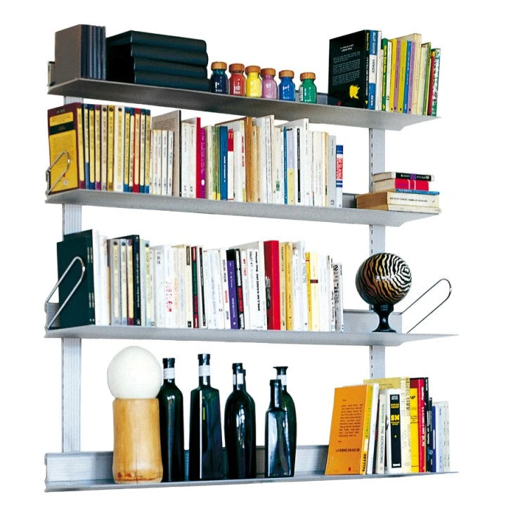 Elegant shelving system in natural anodized extruded aluminium with a sleek and simple design, suitable for both direct mounting on the wall or on uprights, for multiple arrangements.