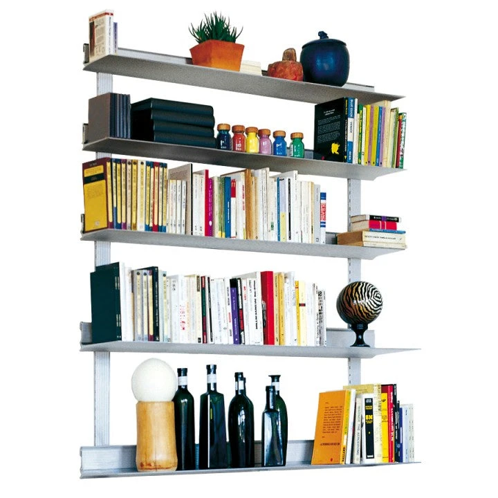Elegant shelving system in natural anodized extruded aluminium with a sleek and simple design, suitable for both direct mounting on the wall or on uprights, for multiple arrangements.