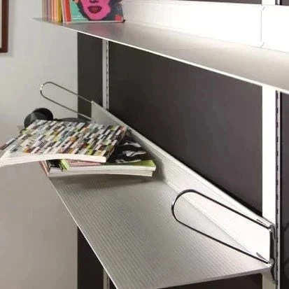 Elegant shelving system in natural anodized extruded aluminium with a sleek and simple design, suitable for both direct mounting on the wall or on uprights, for multiple arrangements.