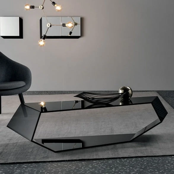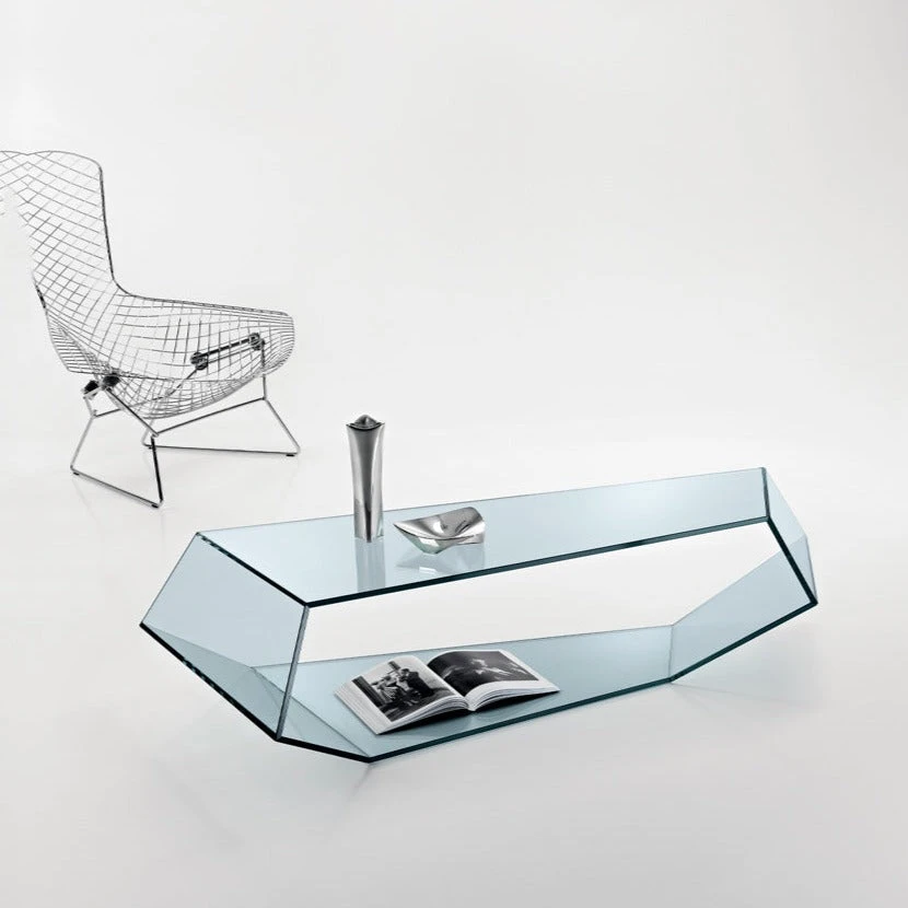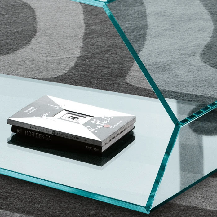 The peculiar angles of these low tables create a pleasant continuous effect of the surface in transparent, extra clear orsmokedglass. They may be placed directly on the floor or uplifted with small feet (included).