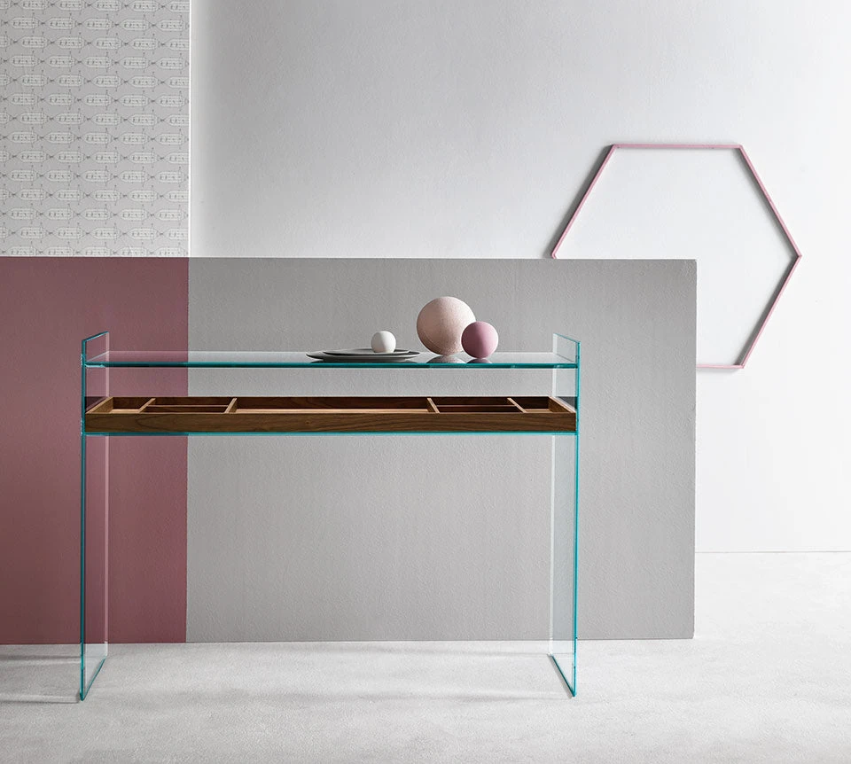 The console Quiller was created by designer Uto Balmoral. It is aconsole made of extra clear bevelled glass, also available with solid walnut Canaletto tray.
