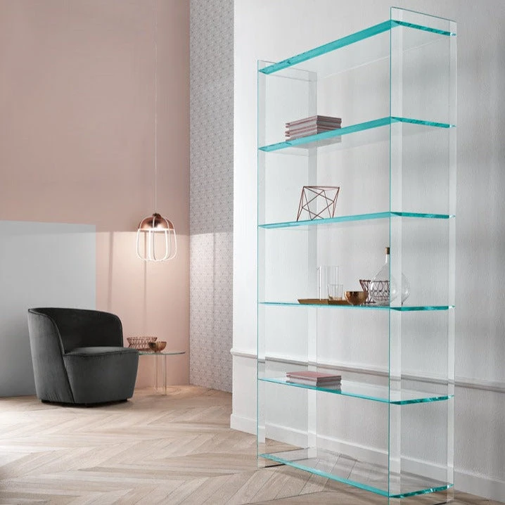 This bookcase is synonymous with lightness and linearity, thanks to the straight shapes and the transparency of the glass,that createslight effects that give brightness to the environment and thus the illusions of greater breadth. It is meant for modern environments and is an excellent match for minimalistic furniture complements.