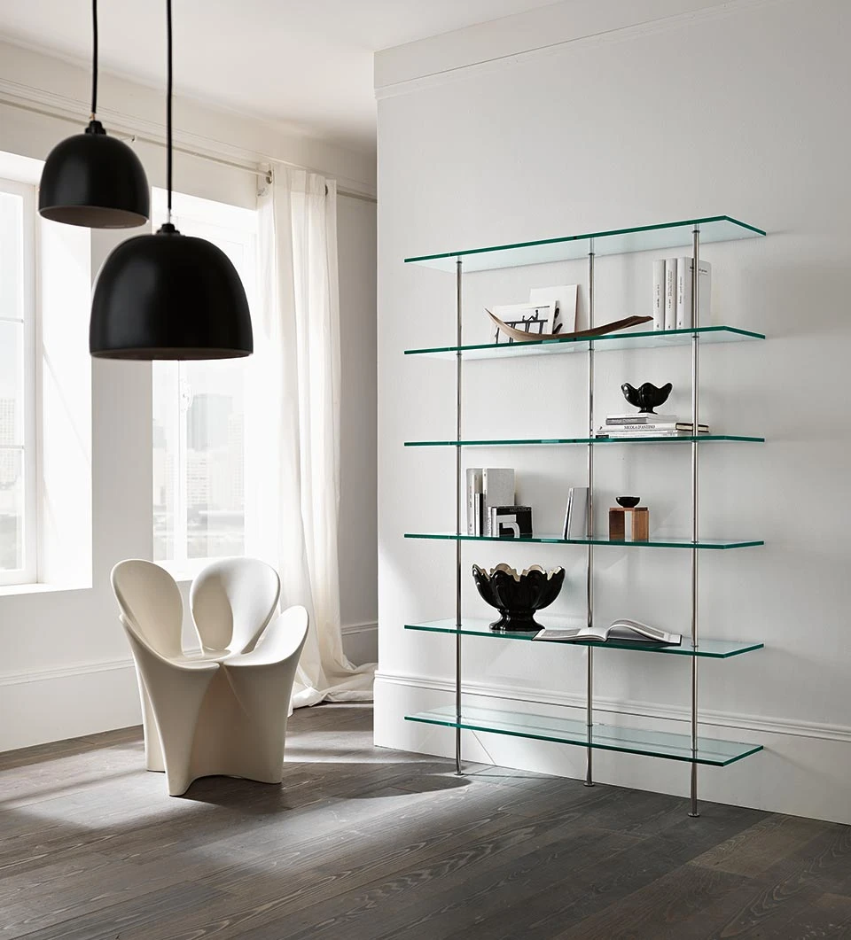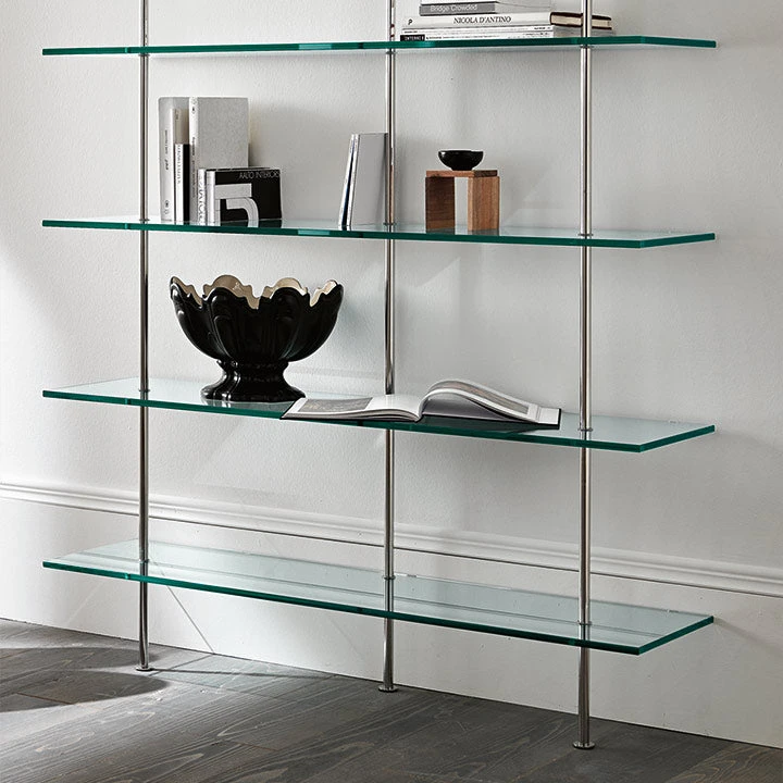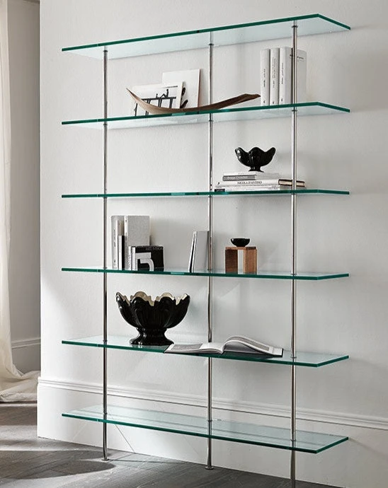 The bookcase Trasparenza, created by designers DUrbino and Lomazzi, stands out for the lightness of the design and the simplicity of the shapes. It is abookcase of contemporary and minimalistic design. It can be composed of five or six shelves and is enriched by chrome metal supports.