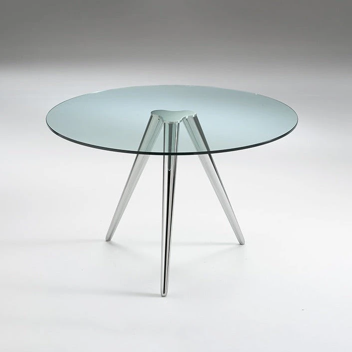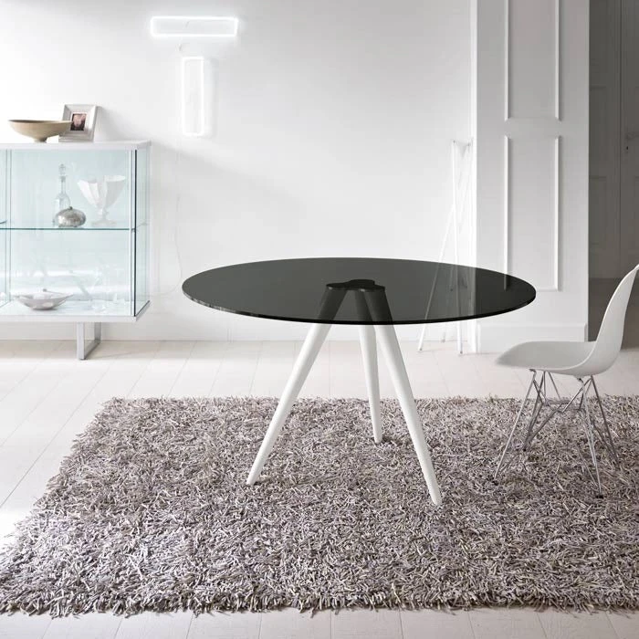 The Unity high glass table was designed by architect Karim Rashid. High table solid and elegant at the same time, Unityis able to adapt to any environment. It is composed of a round top in transparent, smoked or extra-clear tempered glass, and has a base in white or chromed painted metal.