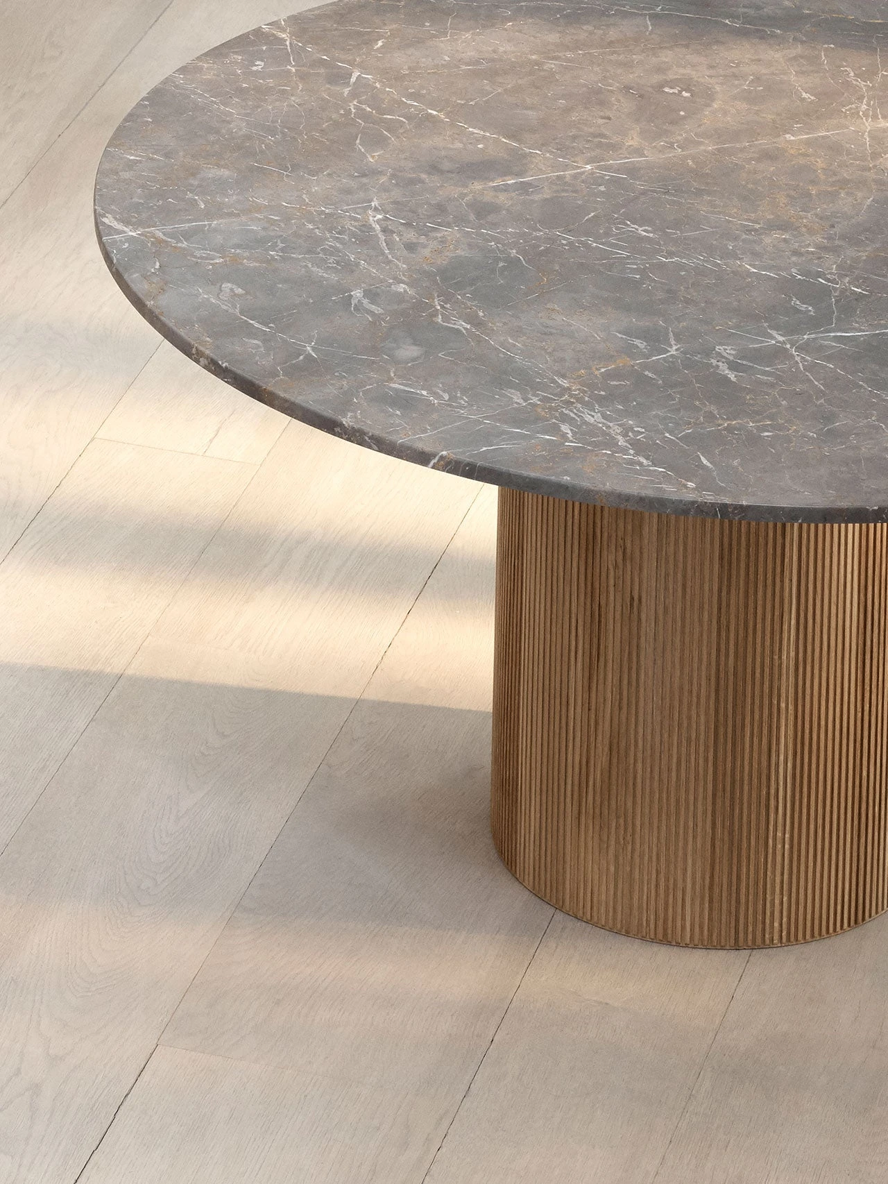 The Vipp Cabin round table features a solid wood base of either oiled oak or dark stainded and lacquered oak. Choose between a durable tabletop of either black or light grey marble or light grey Jura marble