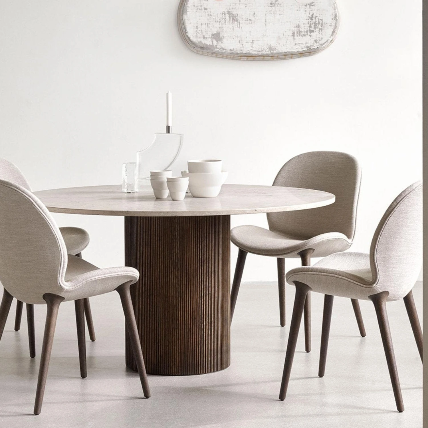 The Vipp Lodge chair is suitable for the dining- or living room. This dining chair features a moulded soft shell and legs of solid oak. The shell of the Lodge chair can be customised in Vipp’s entire upholstery range. Here shown in predefined variants with dark oak or light oak legs.