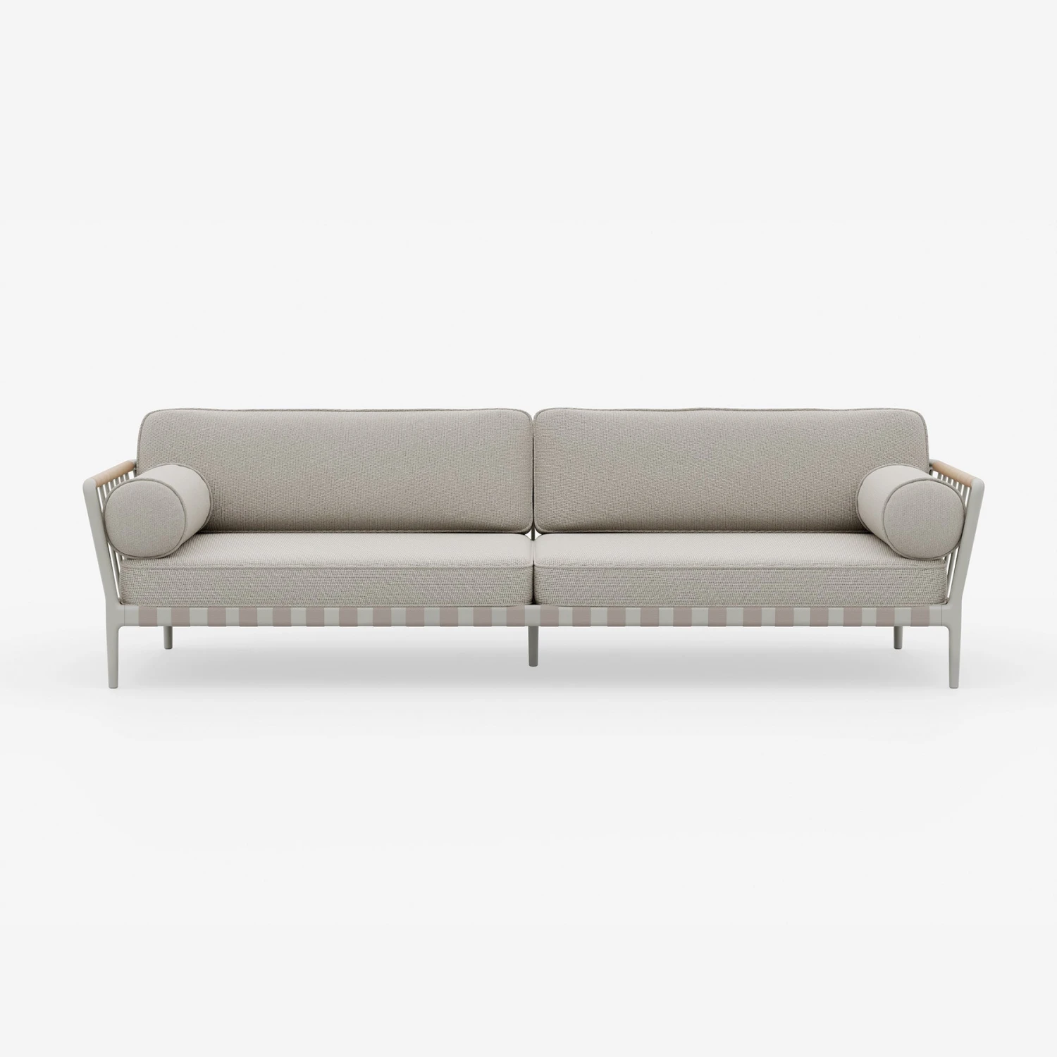 A specially designed system of straps is fitted under the seat cushions to enhance comfort. Straps are visible to echo the rhythmic pattern of the back and armrest. The backrest cushions and bolster pillow are made with a mix of fibre and foam with quick dry capabilities.