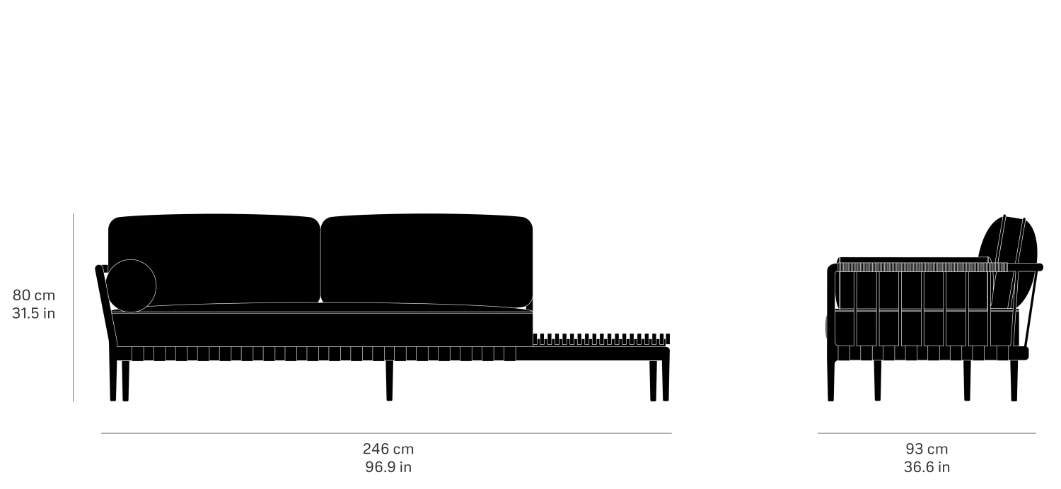 L. 251 cm / 98.8 in, D. 93 cm / 36.6 in, H. 80 cm / 31.5 inSeat height: 40 cm / 15.7 in